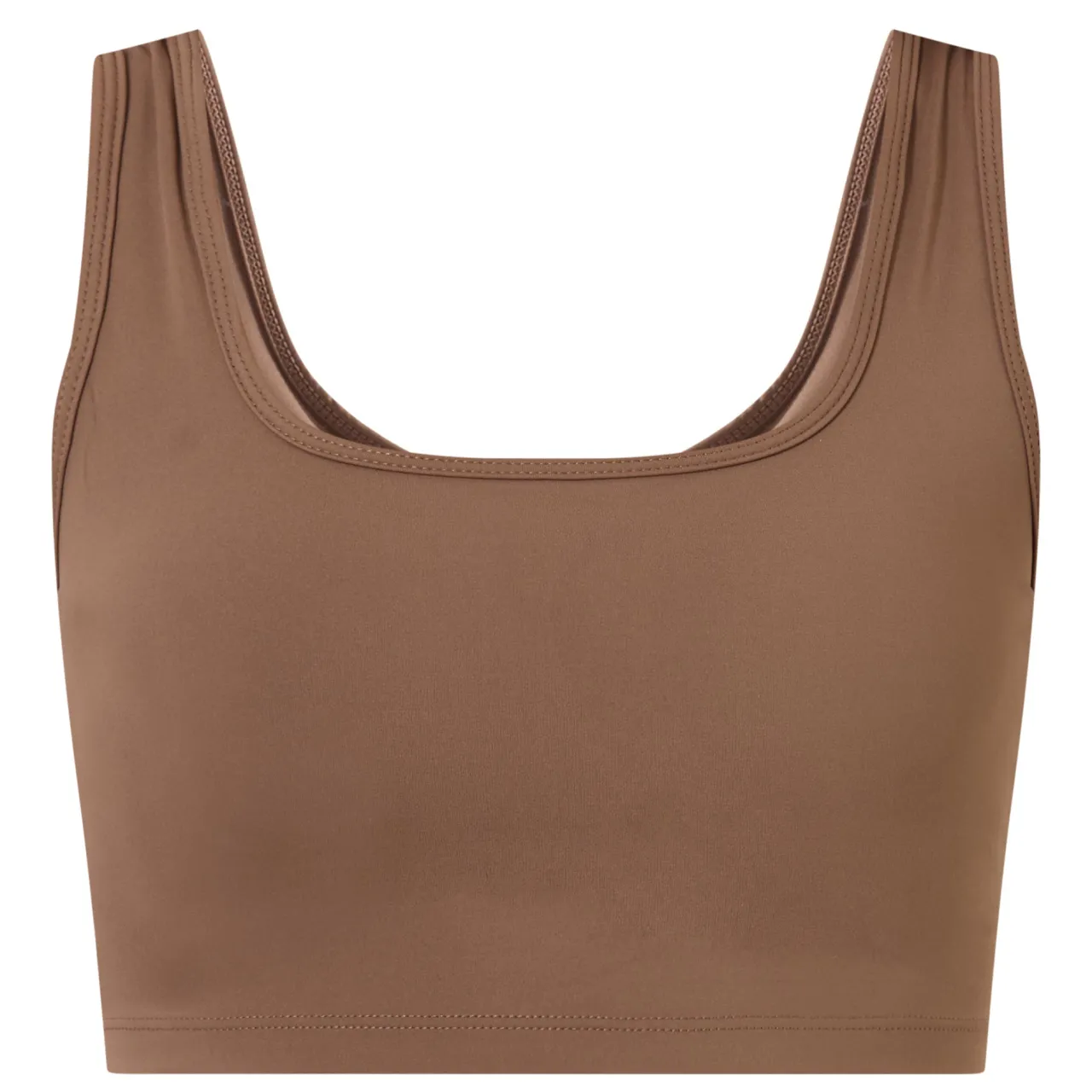 - Elasticated underband, removable cups, wide fixed straps, logo branding on back