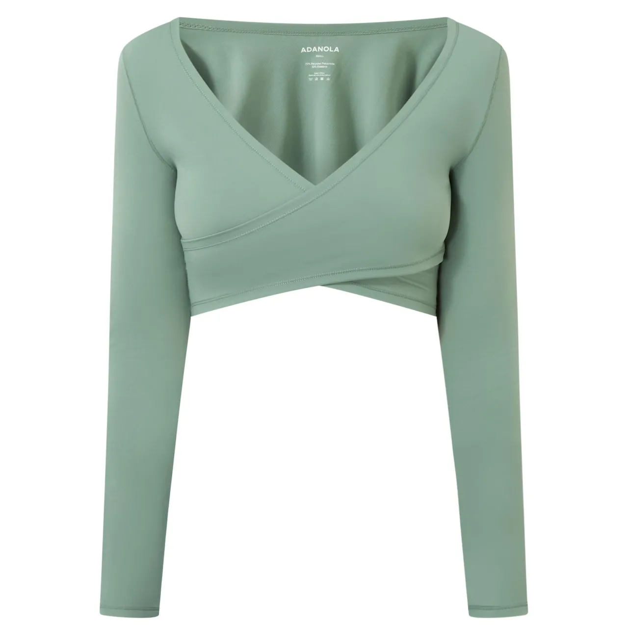 - Wrap over front design, long sleeves, breathable, tonal stitching, smooth fabric