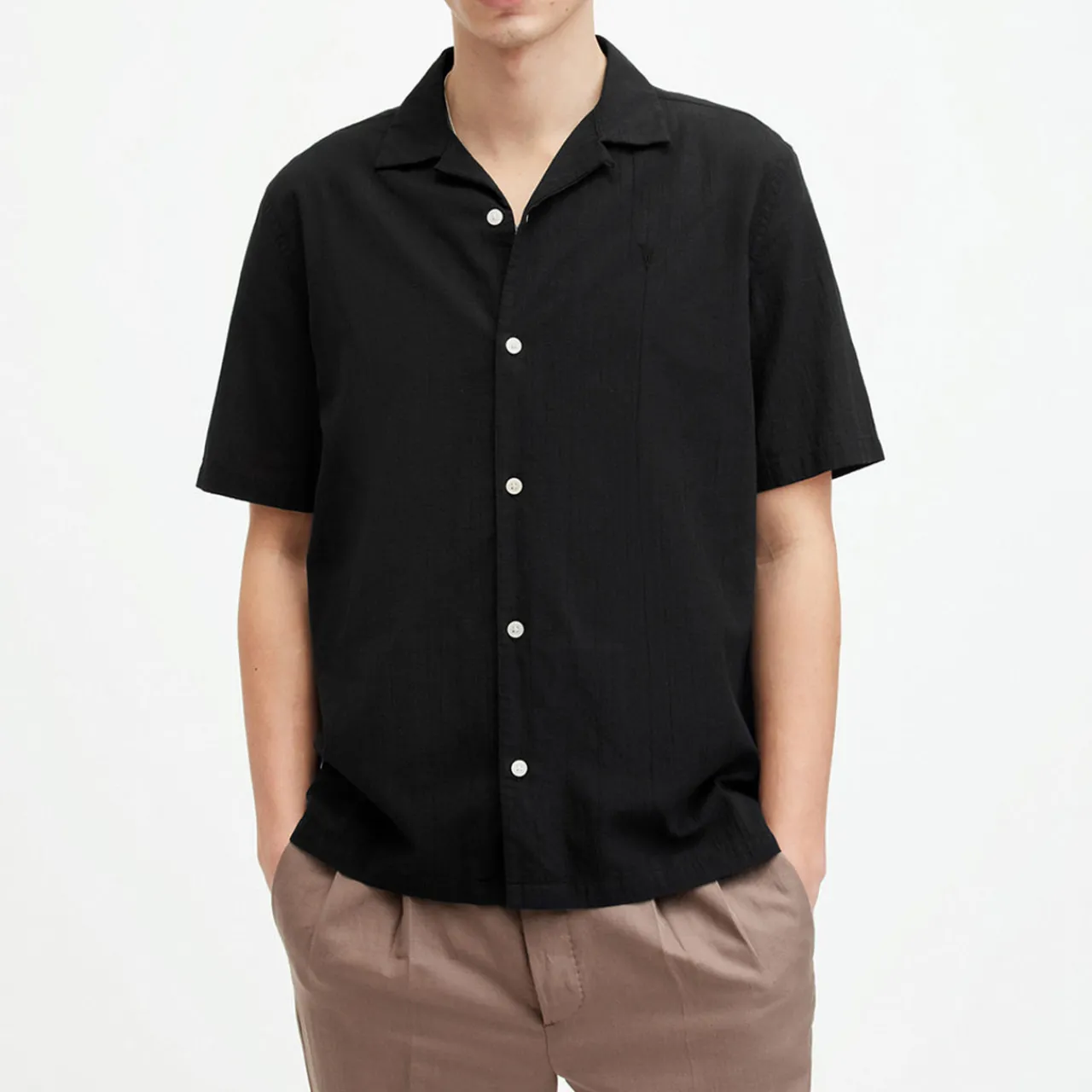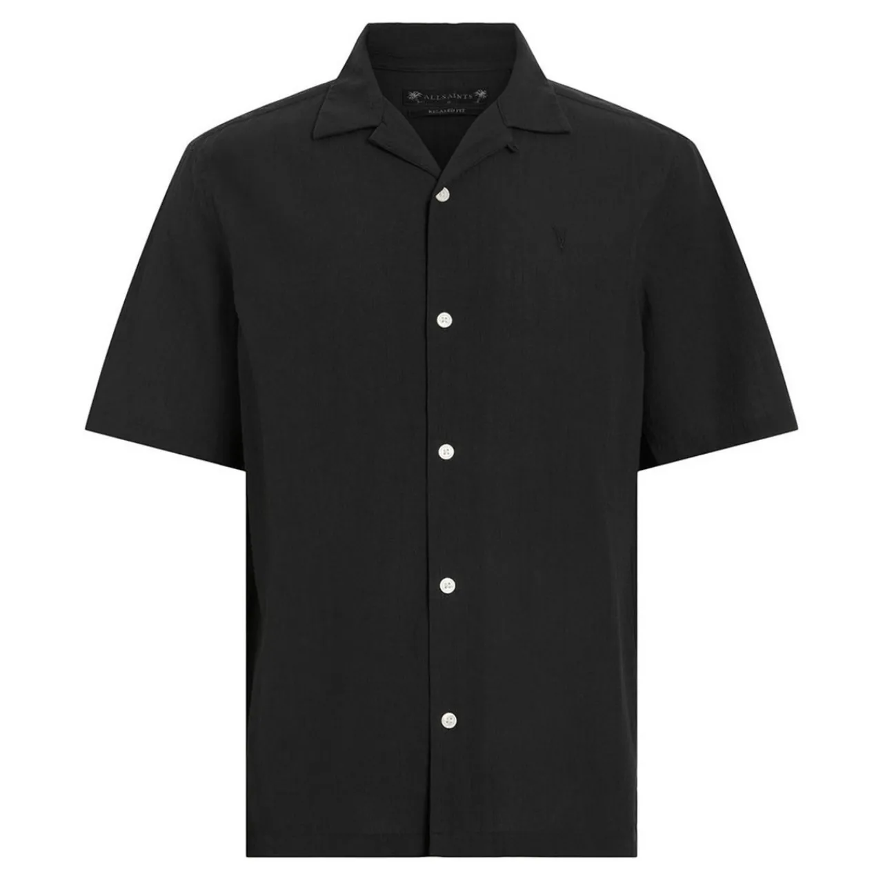 - Camp collar, short sleeves, front button fastening, straight hem, side slit detailing, embroidered logo detail on the chest, Hawaiian shape, lightweight