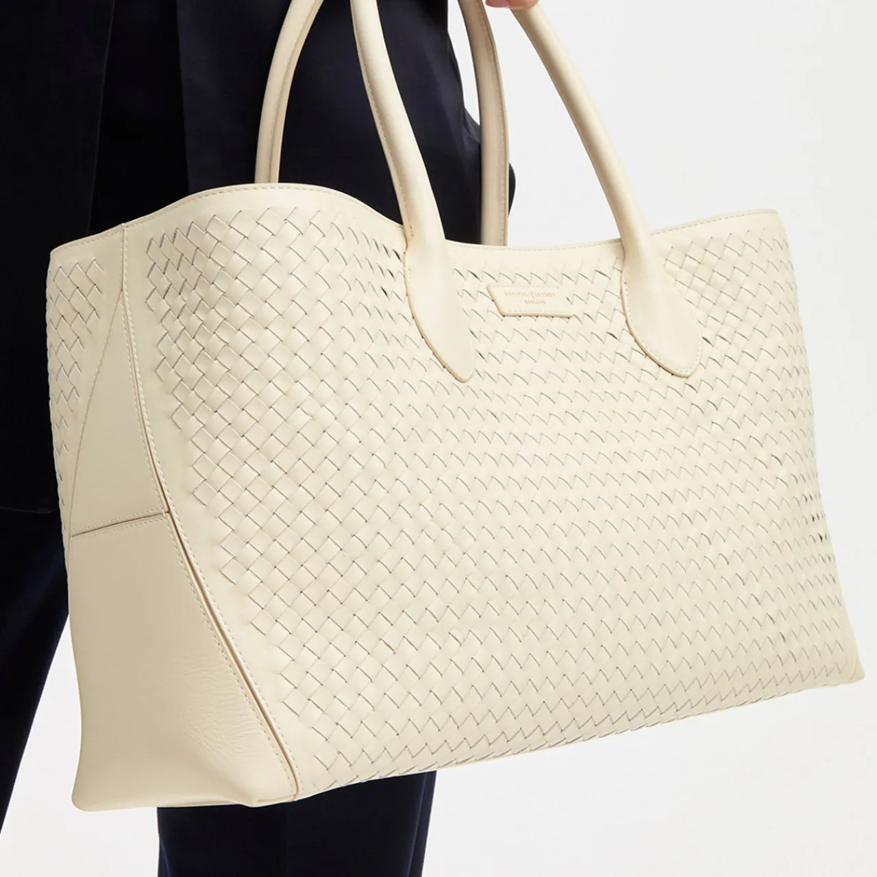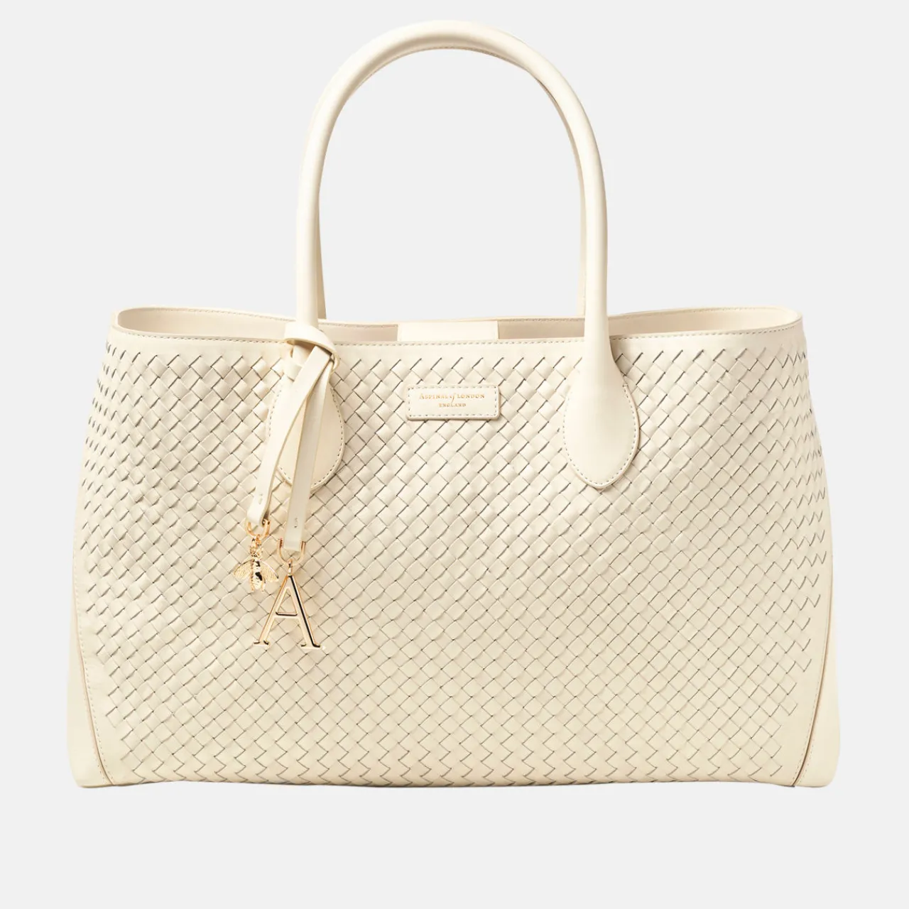 - Top handles, magnetic fastening, detachable and adjustable crossbody strap, woven design, detachable signature charms, gold-tone hardware, logo tag