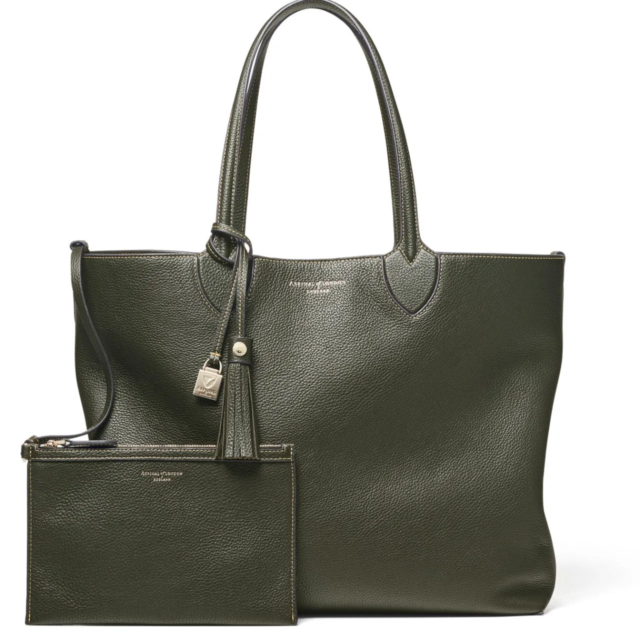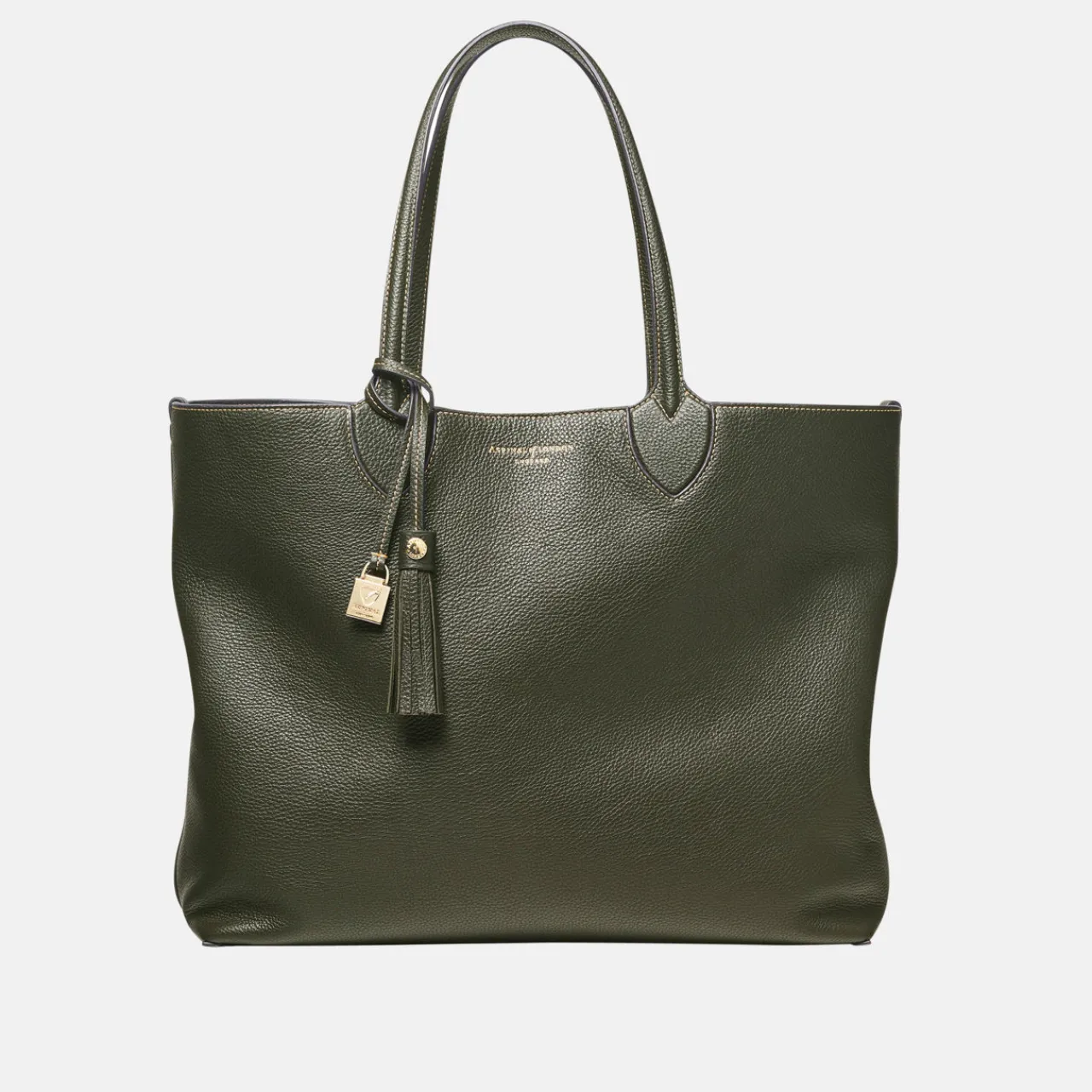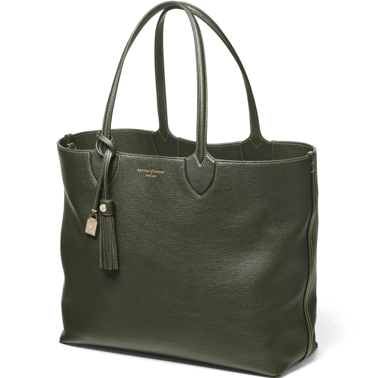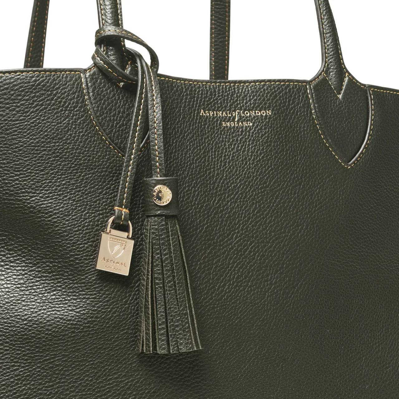 - Two carry handles, open top design, signature hardware detailing, contrast stitching, removable tassel, logo design, pebbled leather finish