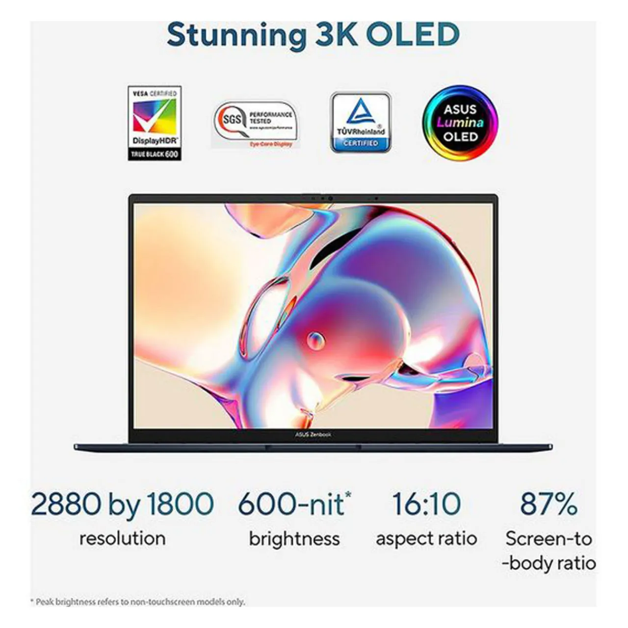 The ultra-vivid 2880 by 1800 ASUS Lumina OLED display makes every moment incredible, with its up to600-nit brightness, web-friendly16:10aspect ratio, and87%screen-to-body ratio. Andadaptive sync automatically adjusts the refresh ratefor always-smooth visuals.