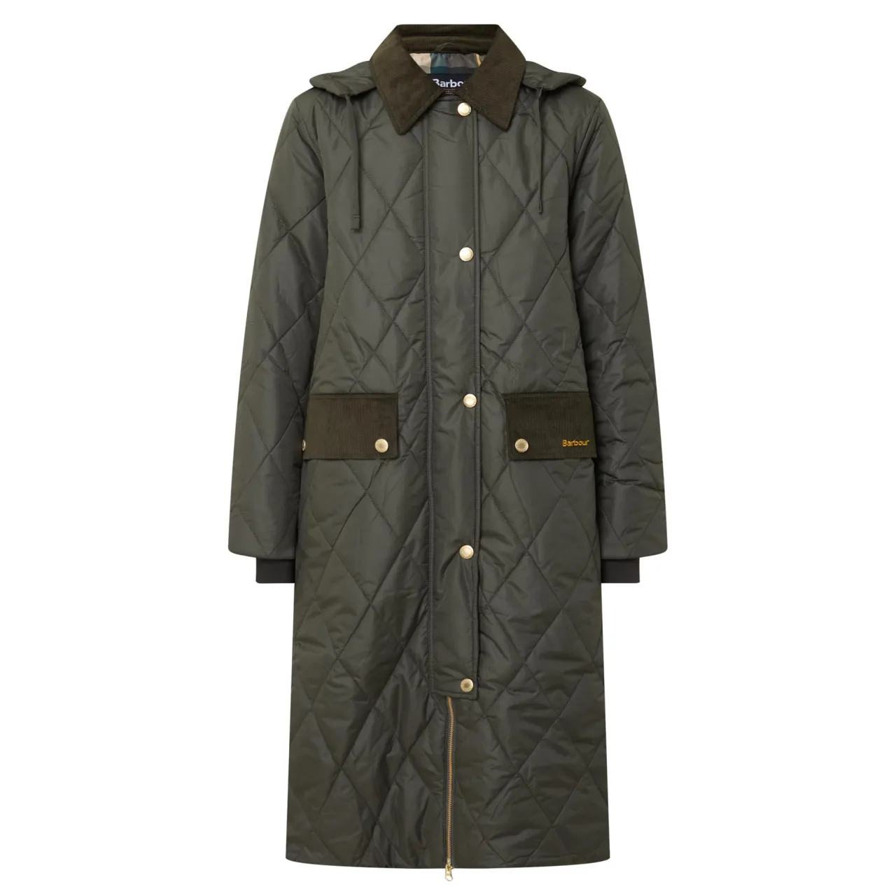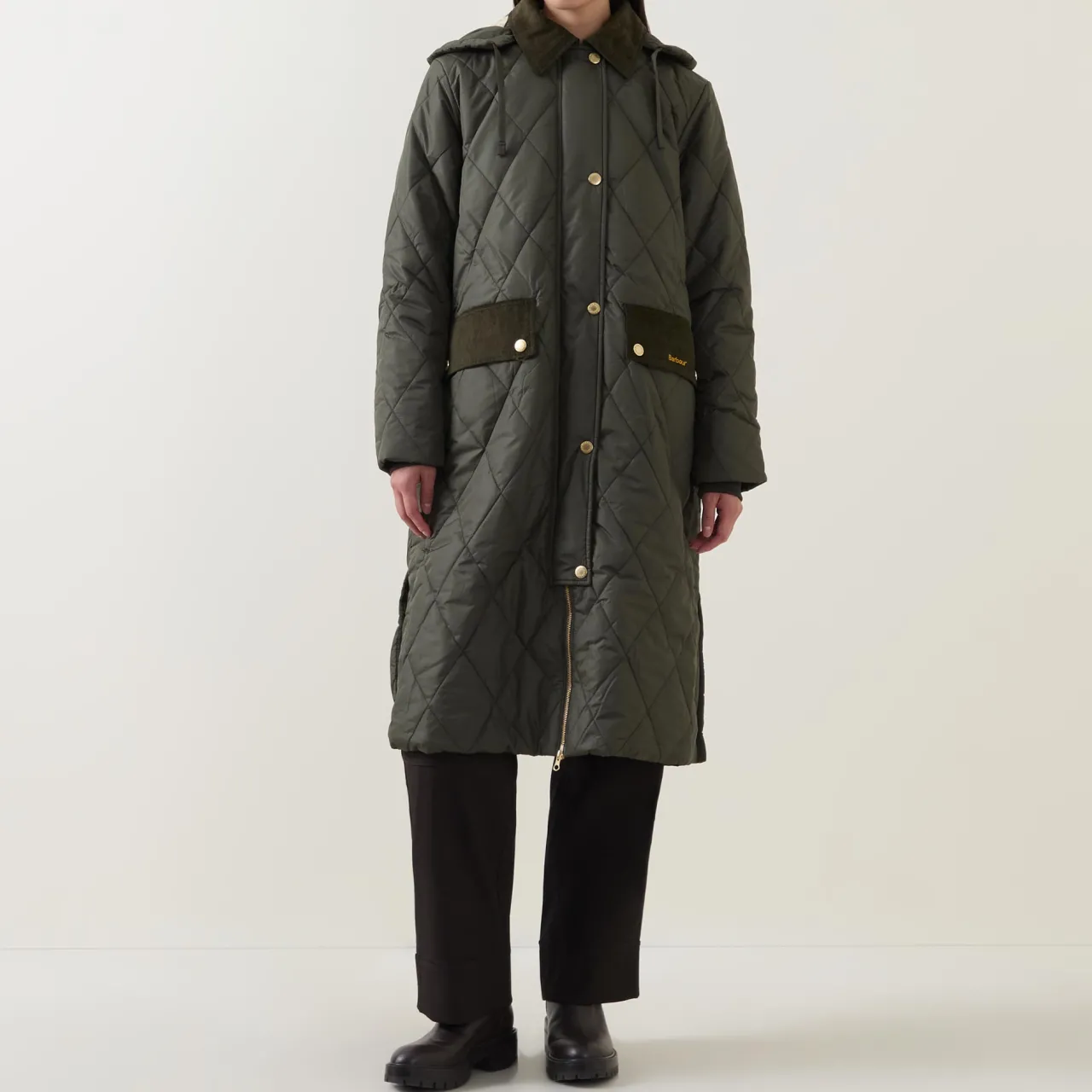 - Point corduroy collar, hood with adjustable drawstring fastening, long sleeves, two-way front zip fastening, additional snap button placket, two large flap pockets with snap button fastenings, snap button side slits, straight hem, quilted design, logo branding, mid length