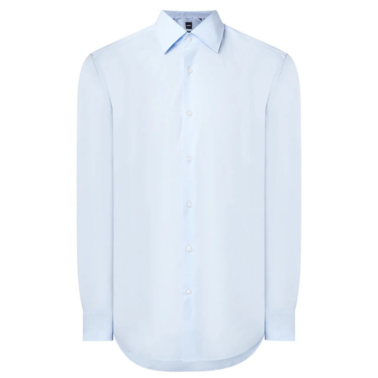 - Cutaway collar, long sleeves, button fastening, single-button cuffs, tonal stitching, curved hemline, smooth fabric