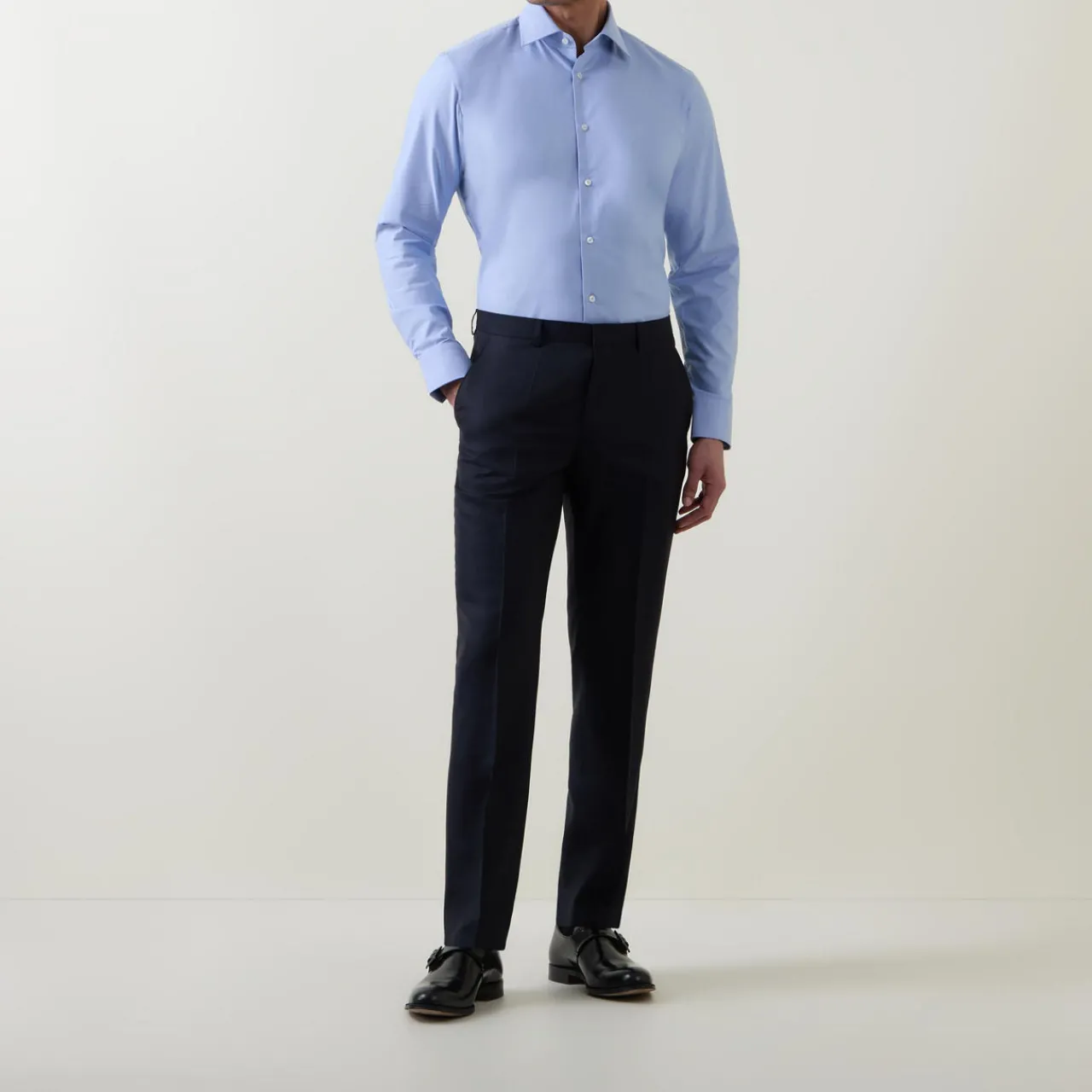 - Classic collar, button fastening, long sleeves, single cuff, curved hemline, stretch-fused fabric, easy iron