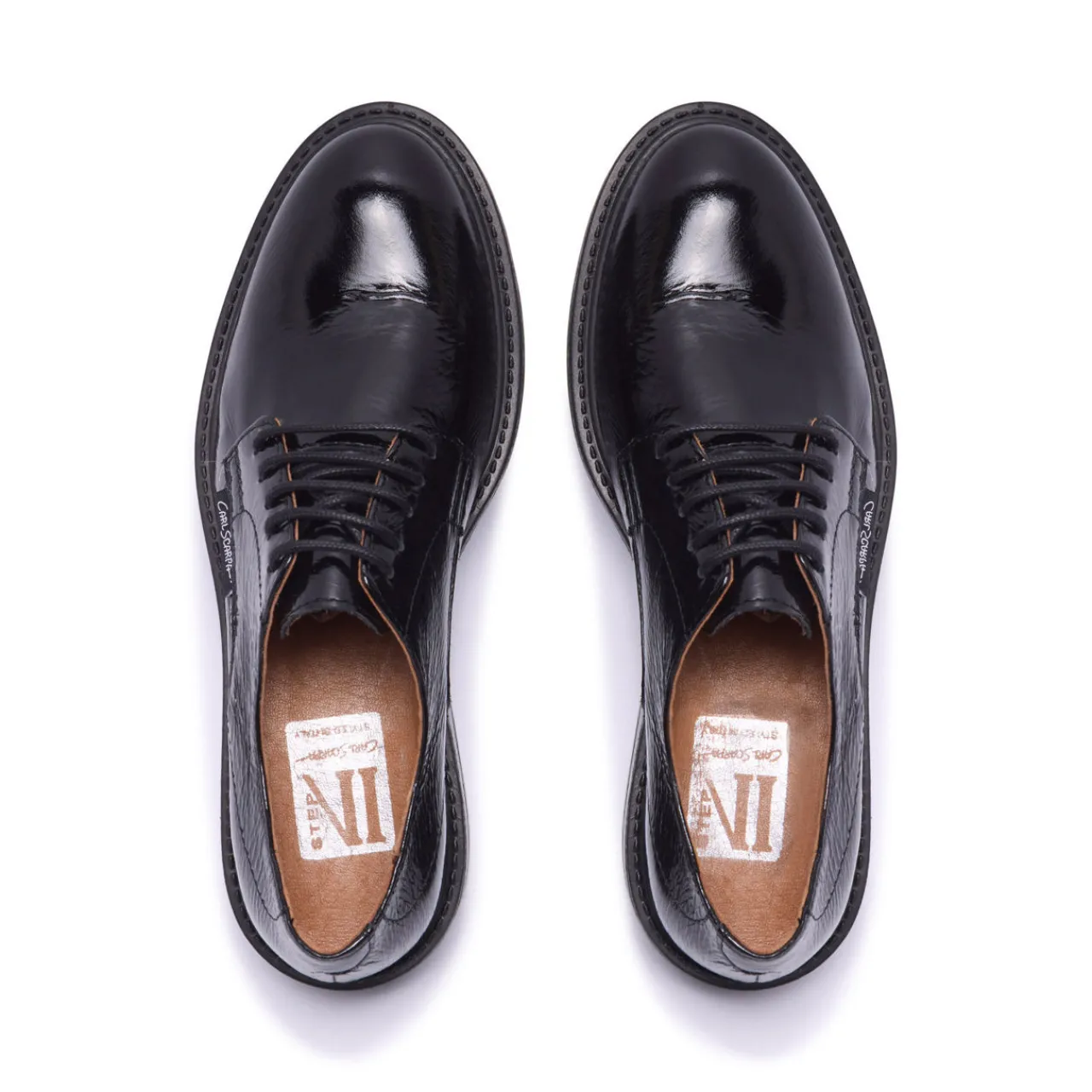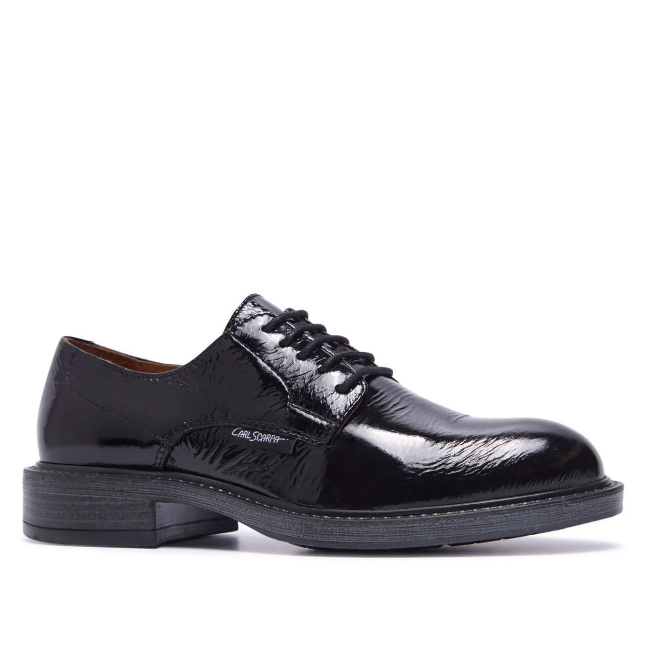 - Smooth patent leather finish, lace-up fastening, leather-lined insole, almond toe, brand logo detail, block heel