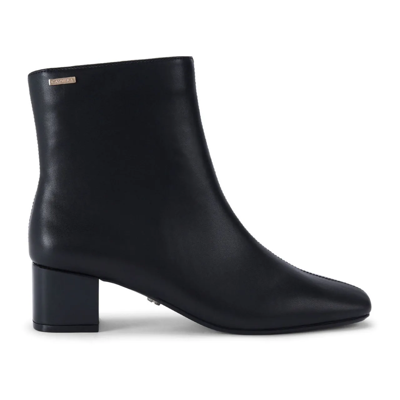 - Ankle style, smooth finish, tapered square toe, centre seam detail, covered block heel, inside zip fastening, metal logo detail