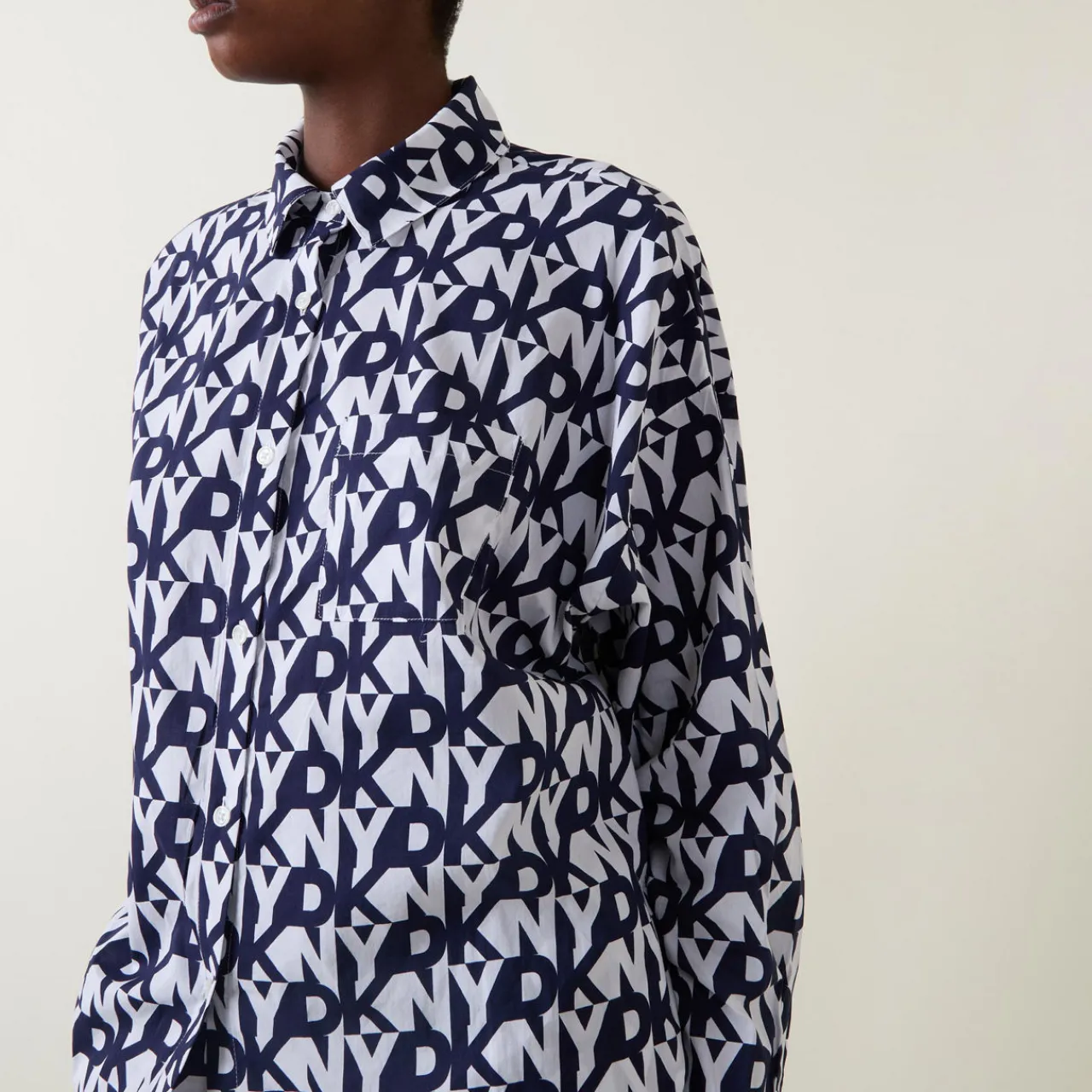 - Two-piece: Top: Shirt collar, dropped shoulders, long sleeves, buttoned cuffs, one chest patch pocket, front button fastening, straight hem, monogram logo print; Bottoms: High-rise, straight leg, full length, elasticated waistband, clean hems, monogram logo print