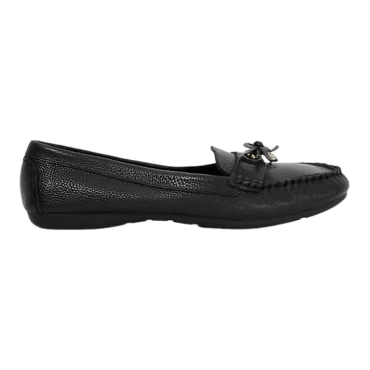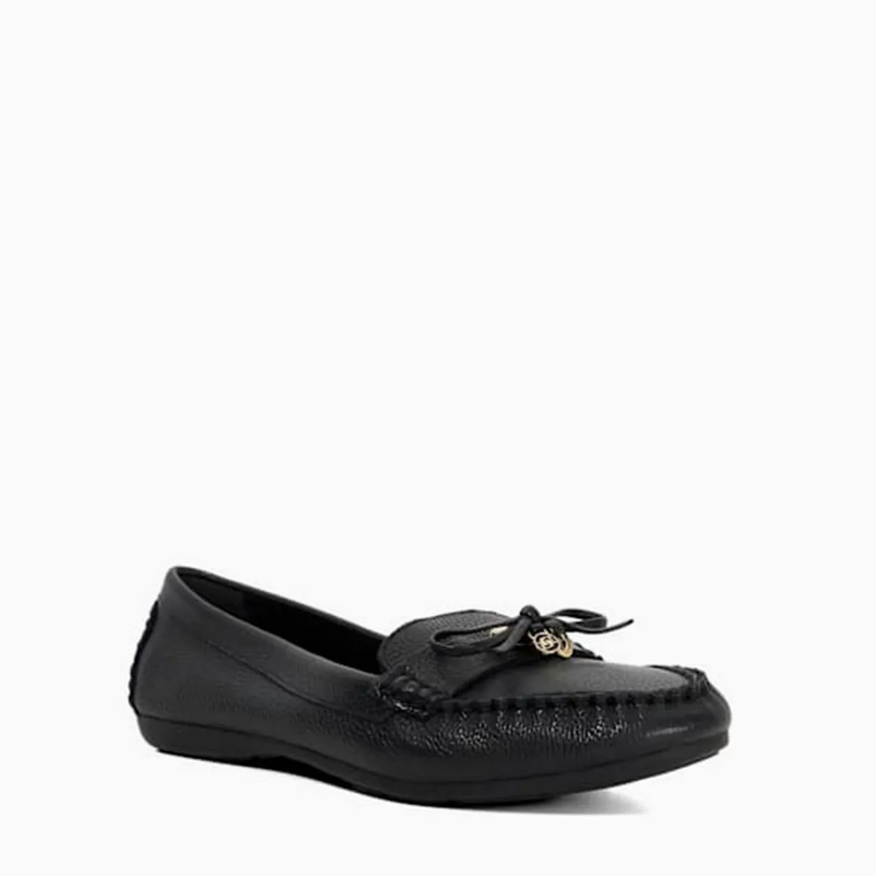 - Leather moccasins with ornate bow detail, gold logo, round jewelled charm, cushioned insole, wide fit for comfort
