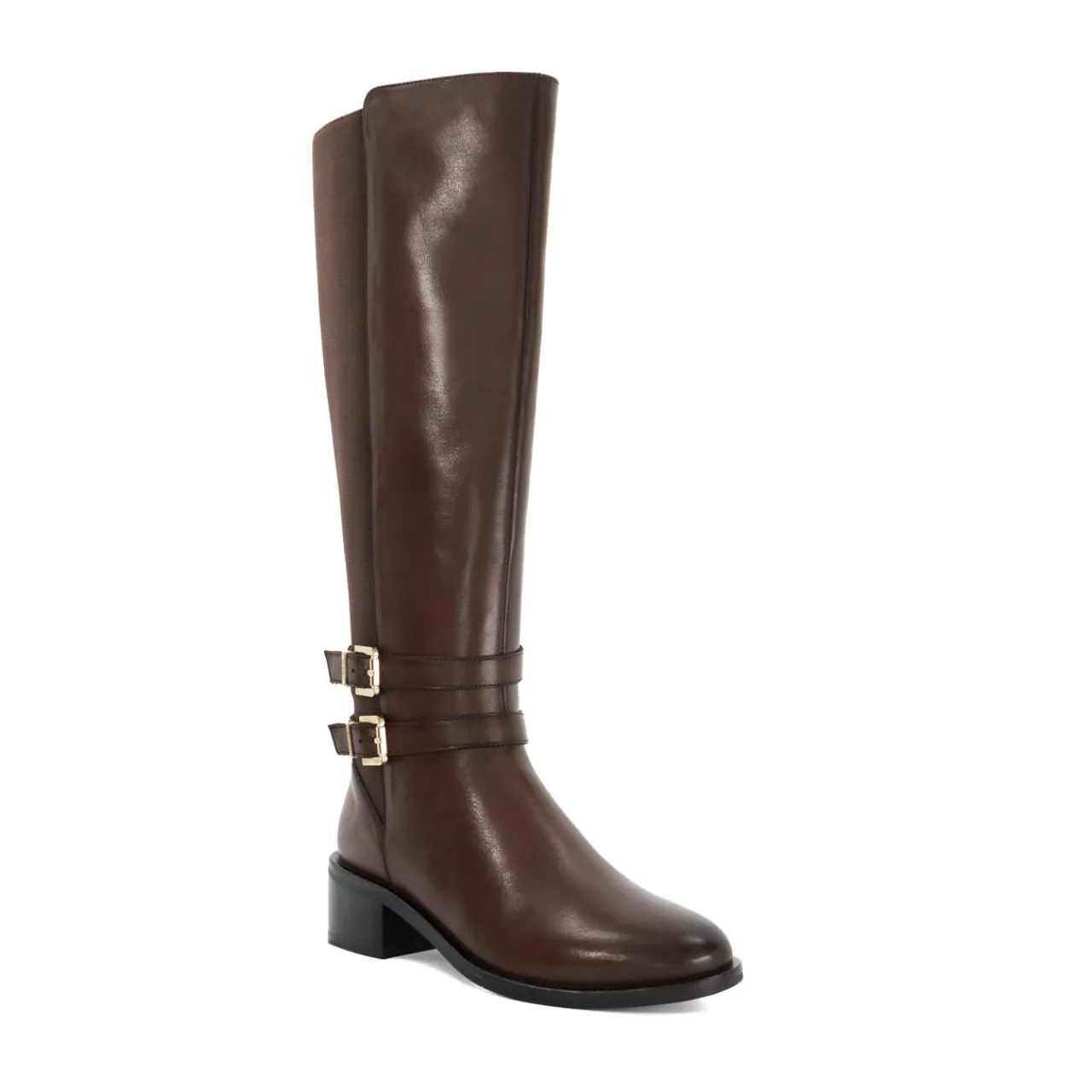 - Double strap with gold-tone buckles, side zip, elasticated side panel, low block heel