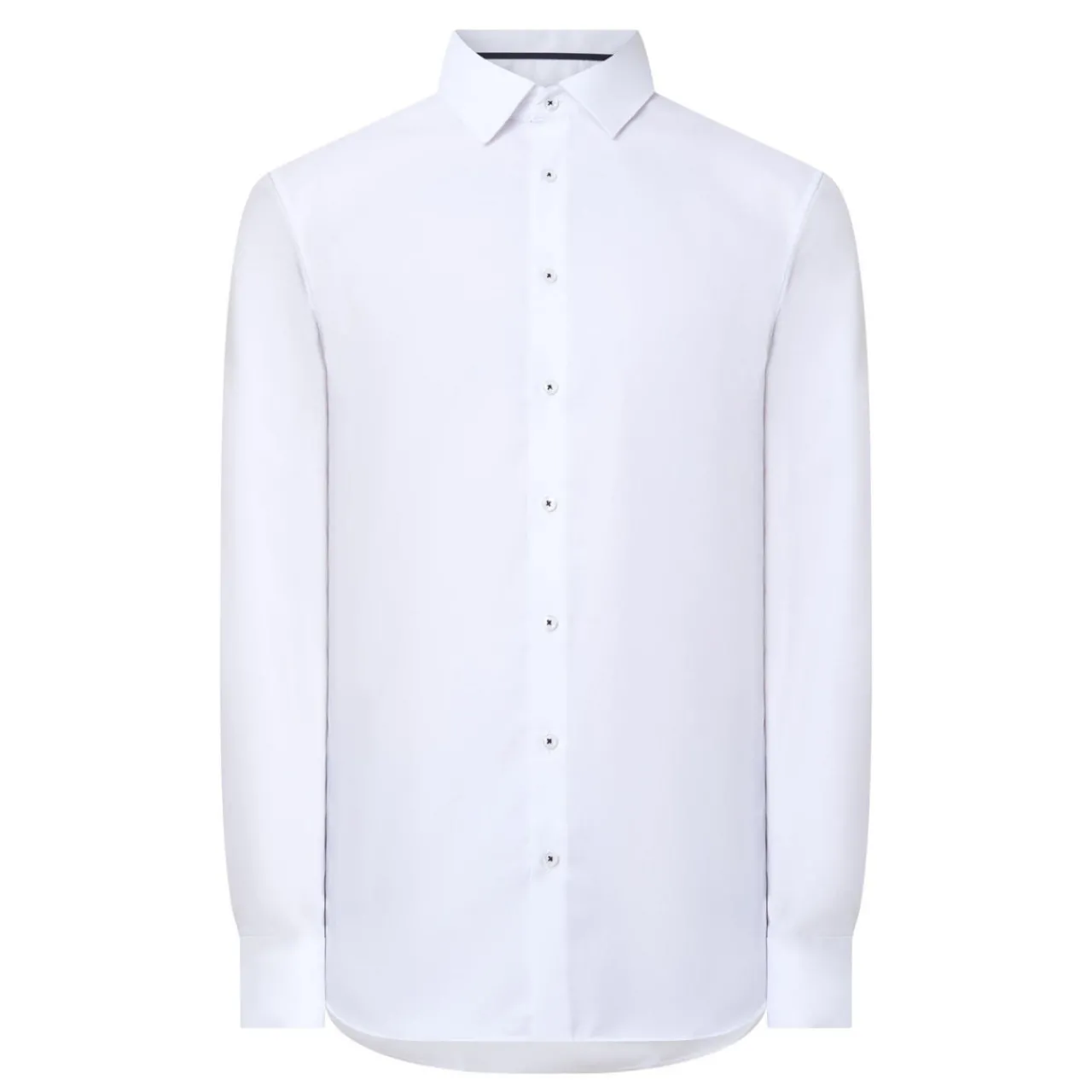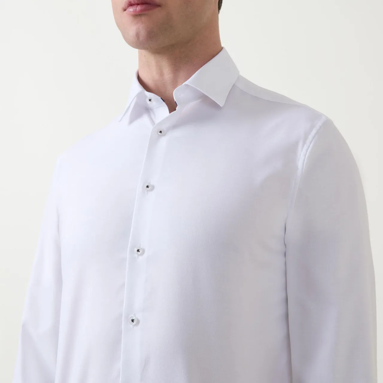 - Pointed collar, long sleeves, button fastenings, curved hemline, buttoned cuffs, single cuffs