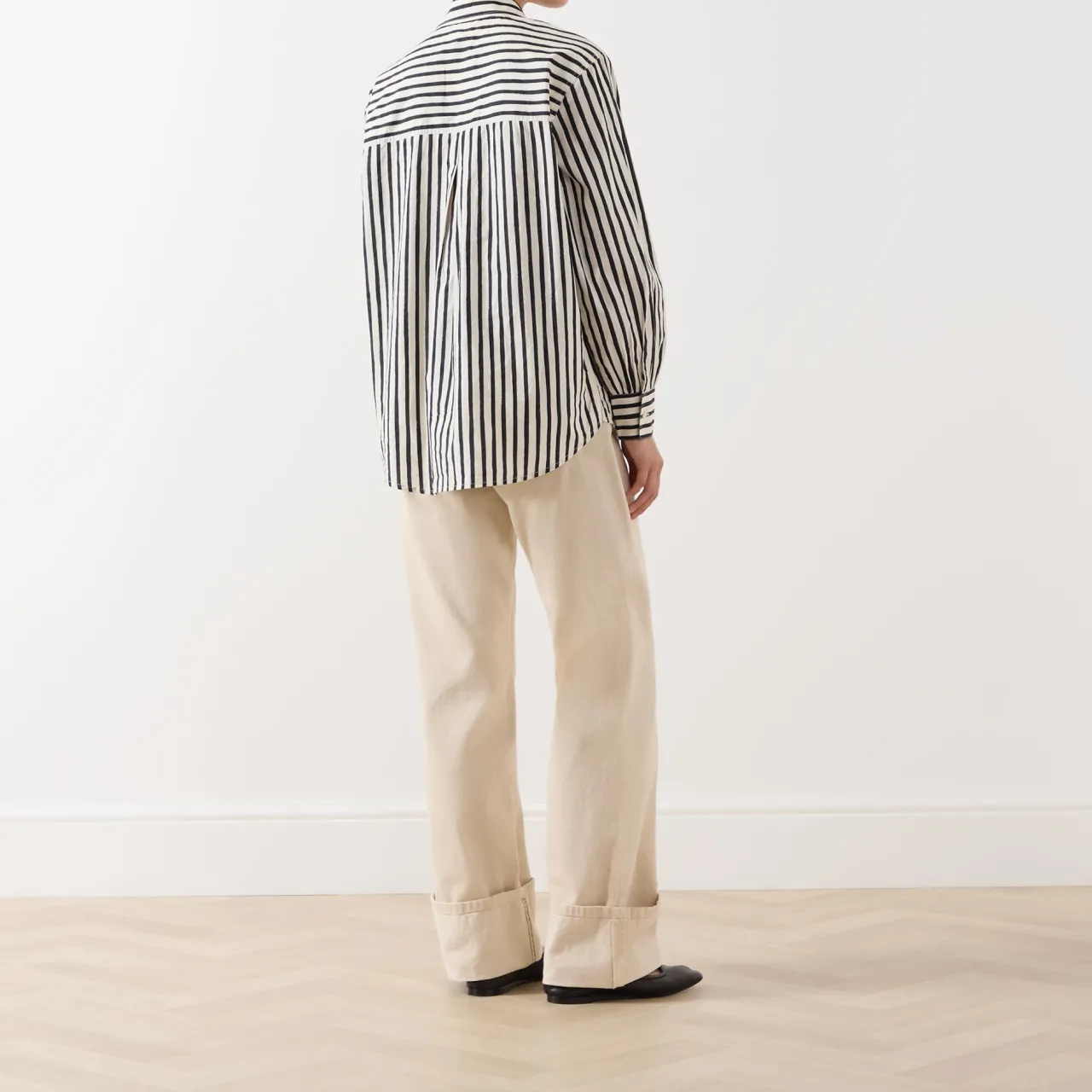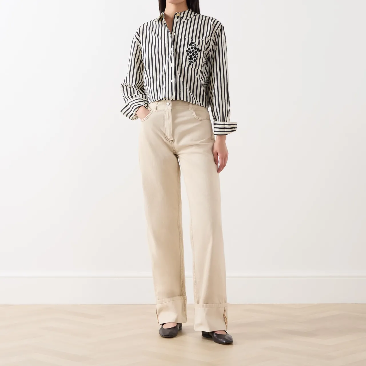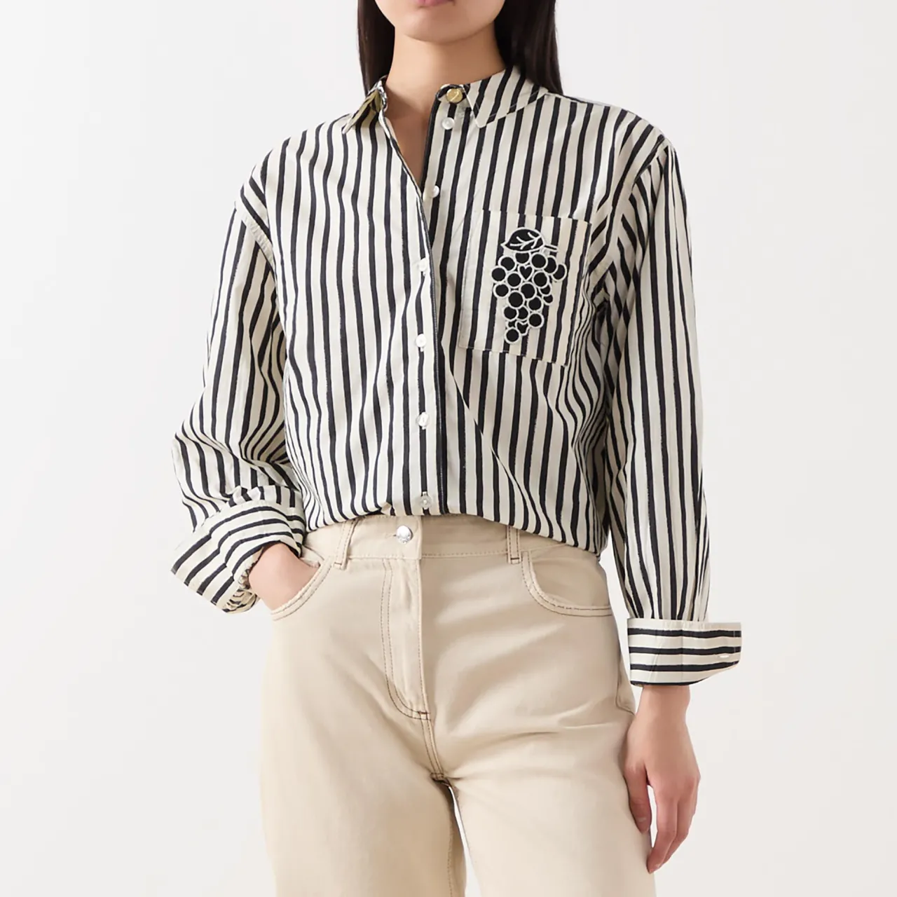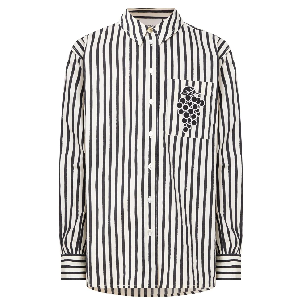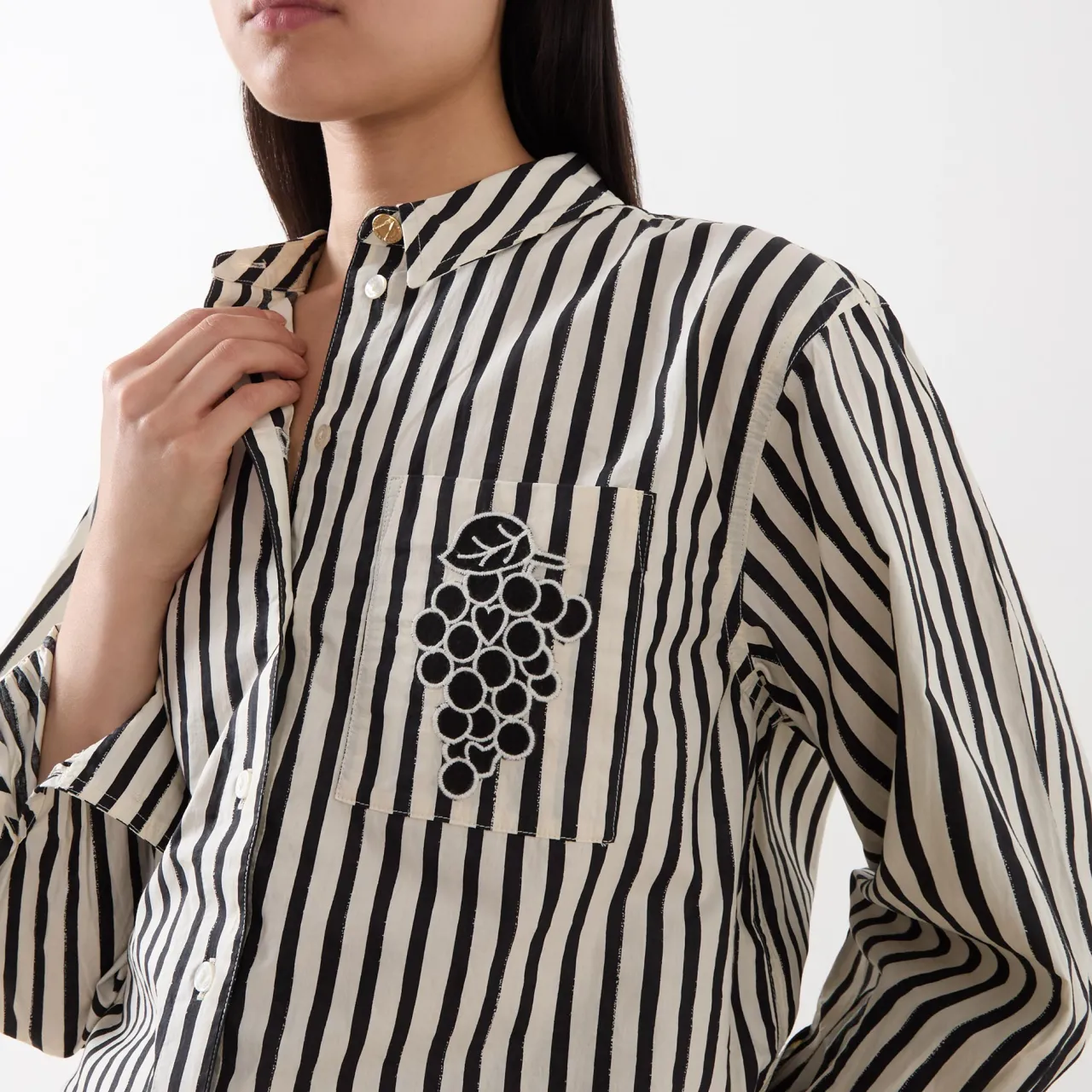 - Point collar, long sleeves, dropped shoulders, front button fastenings, chest patch pocket with grapes, all-over striped pattern, single-button cuffs, curved hemline, smooth fabric