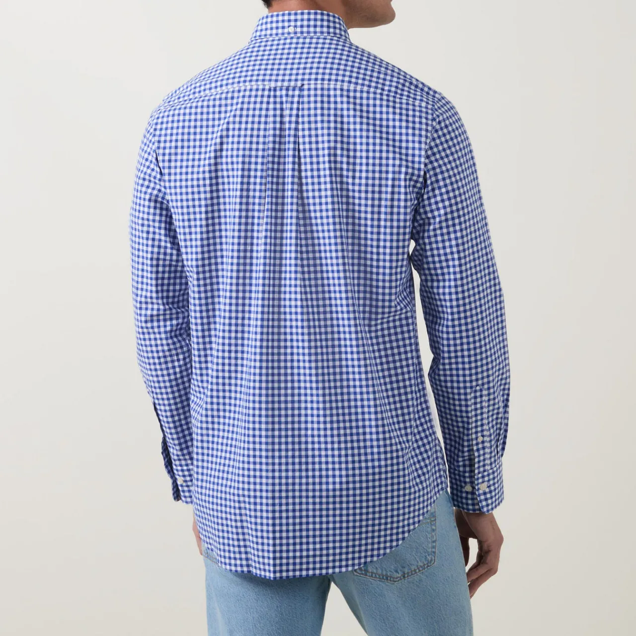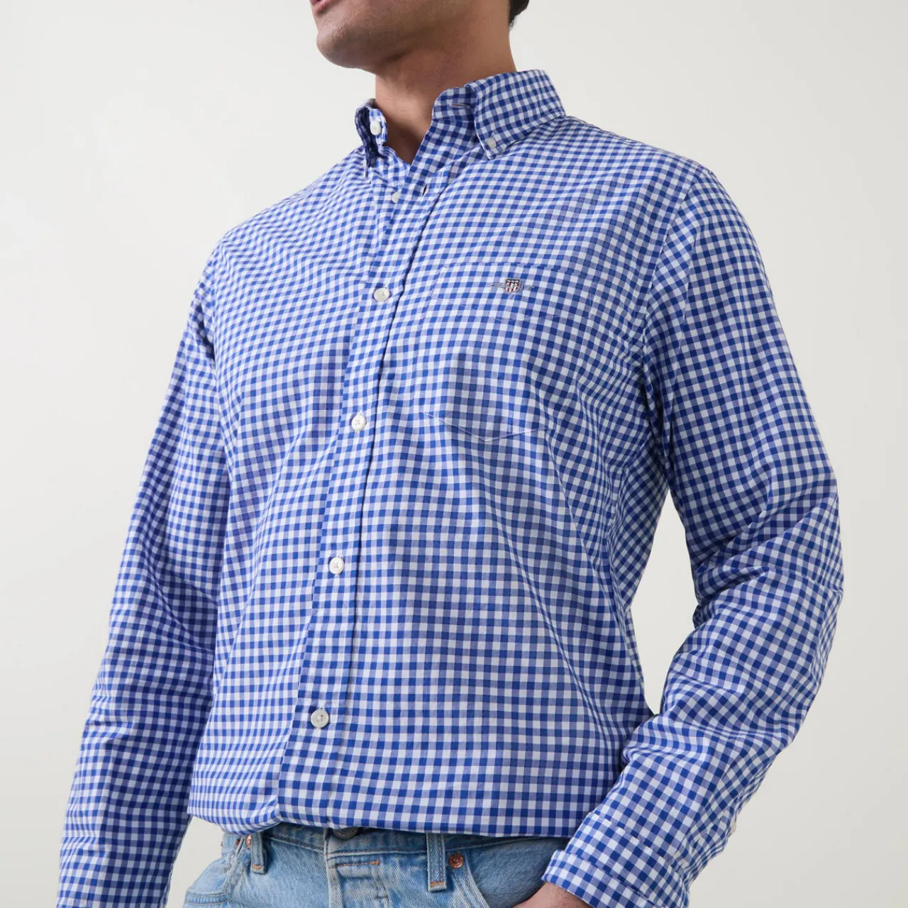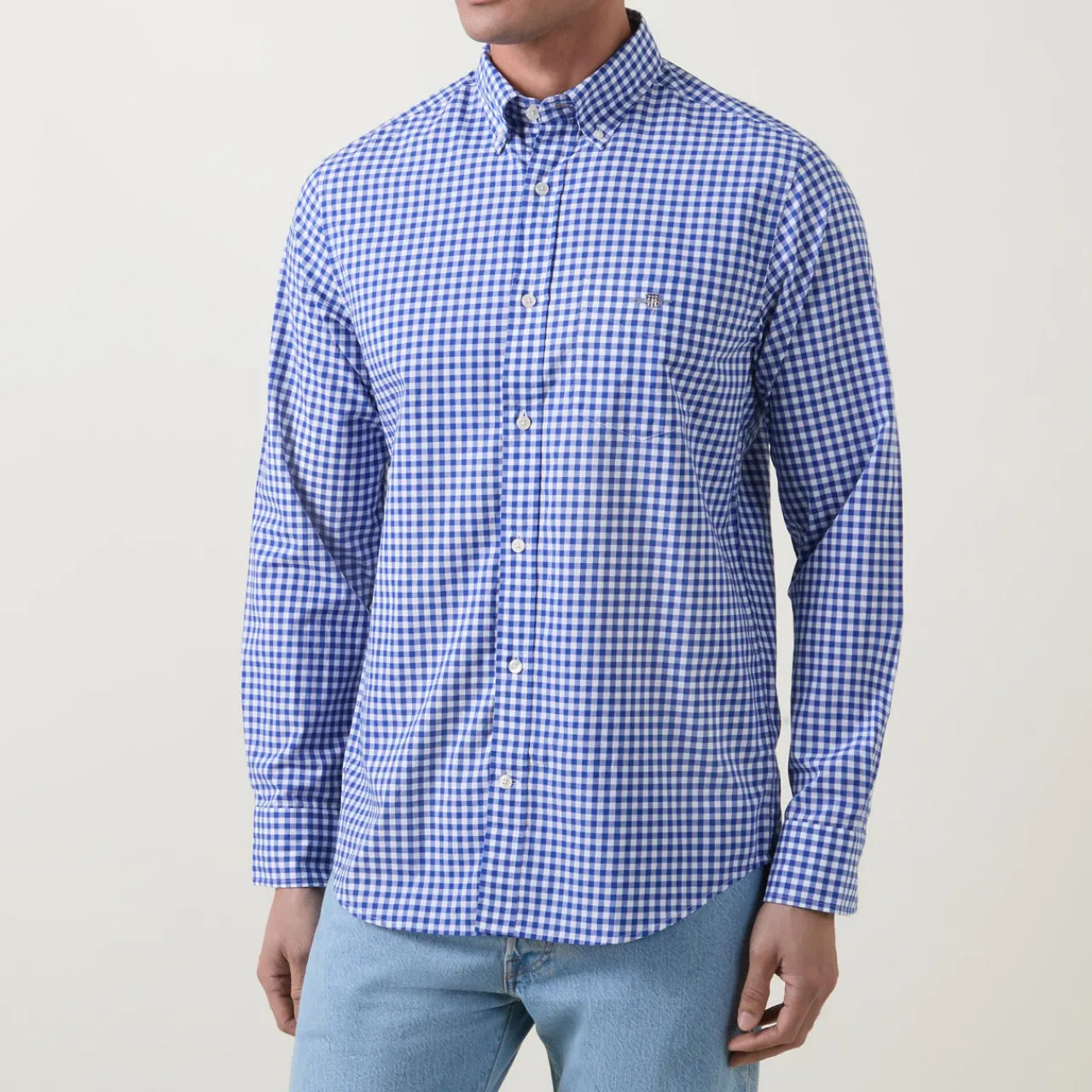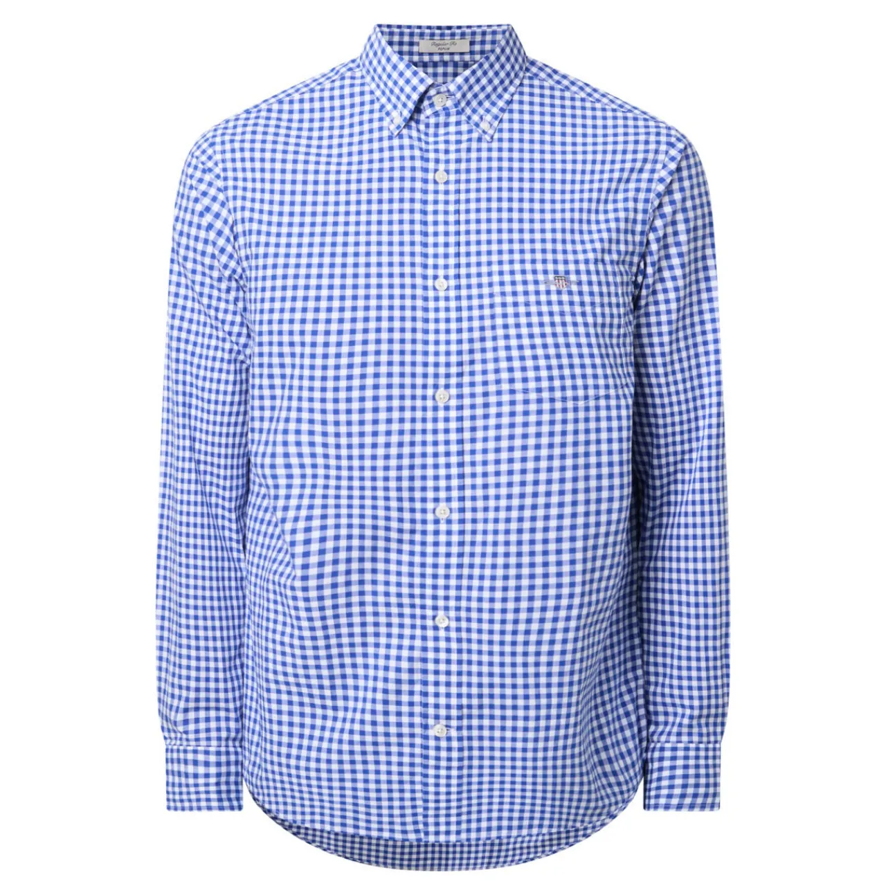 - Gingham pattern, long sleeves, button-down collar, logo detail, curved hemline