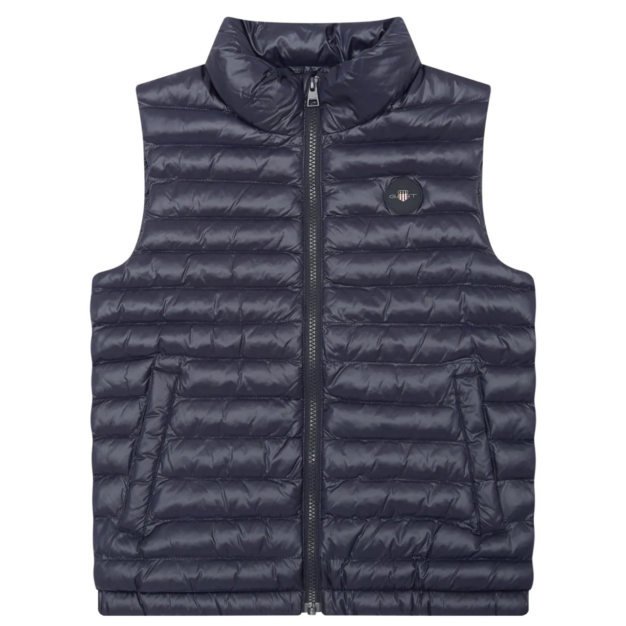 - Standing collar, concealed zip fastening, padded, lightweight, shiny finish, welt slanted pockets, sleeveless, soft elastic hem, shield logo badge, durable water-repellent finish