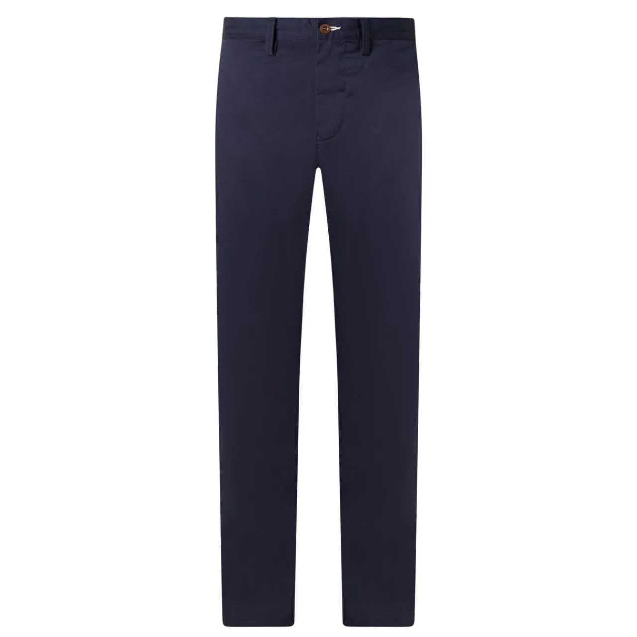 - Mid-rise, regular-fit, chambray interior waistband, coin pocket, two side slit pockets, two rear welt pockets with button closure, logo detail
