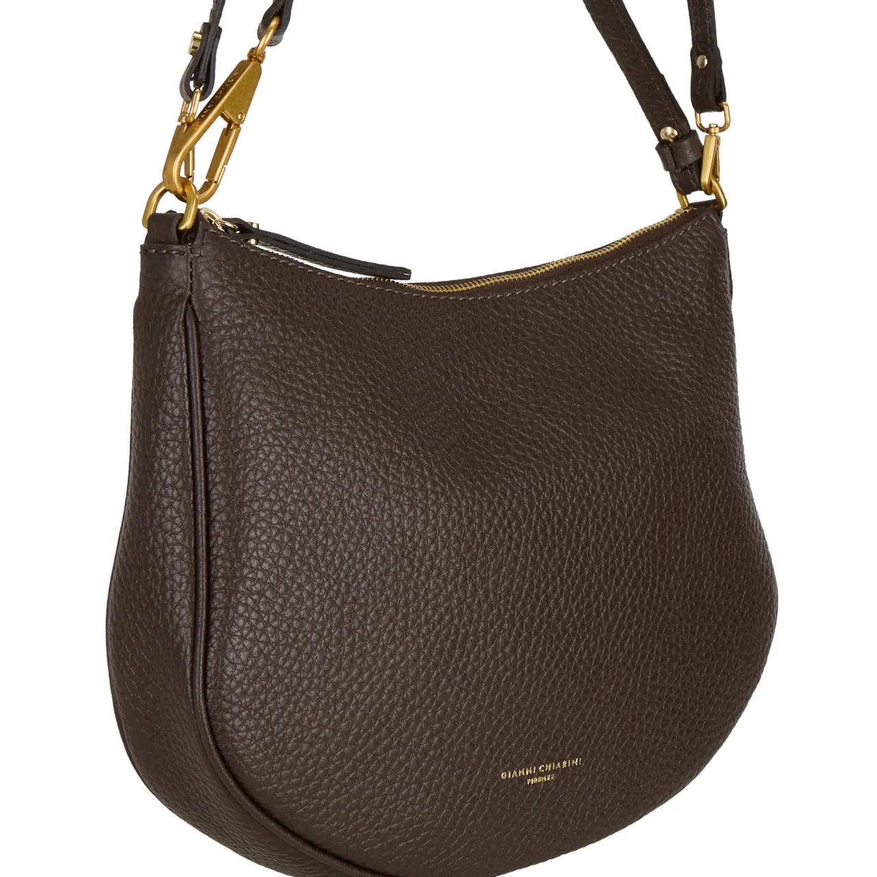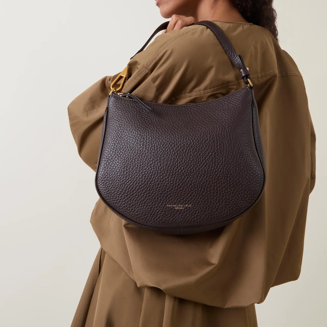 - Curved shape, shoulder strap, detachable crossbody strap, gold-tone hardware, top-zip fastening, logo details, grained finish