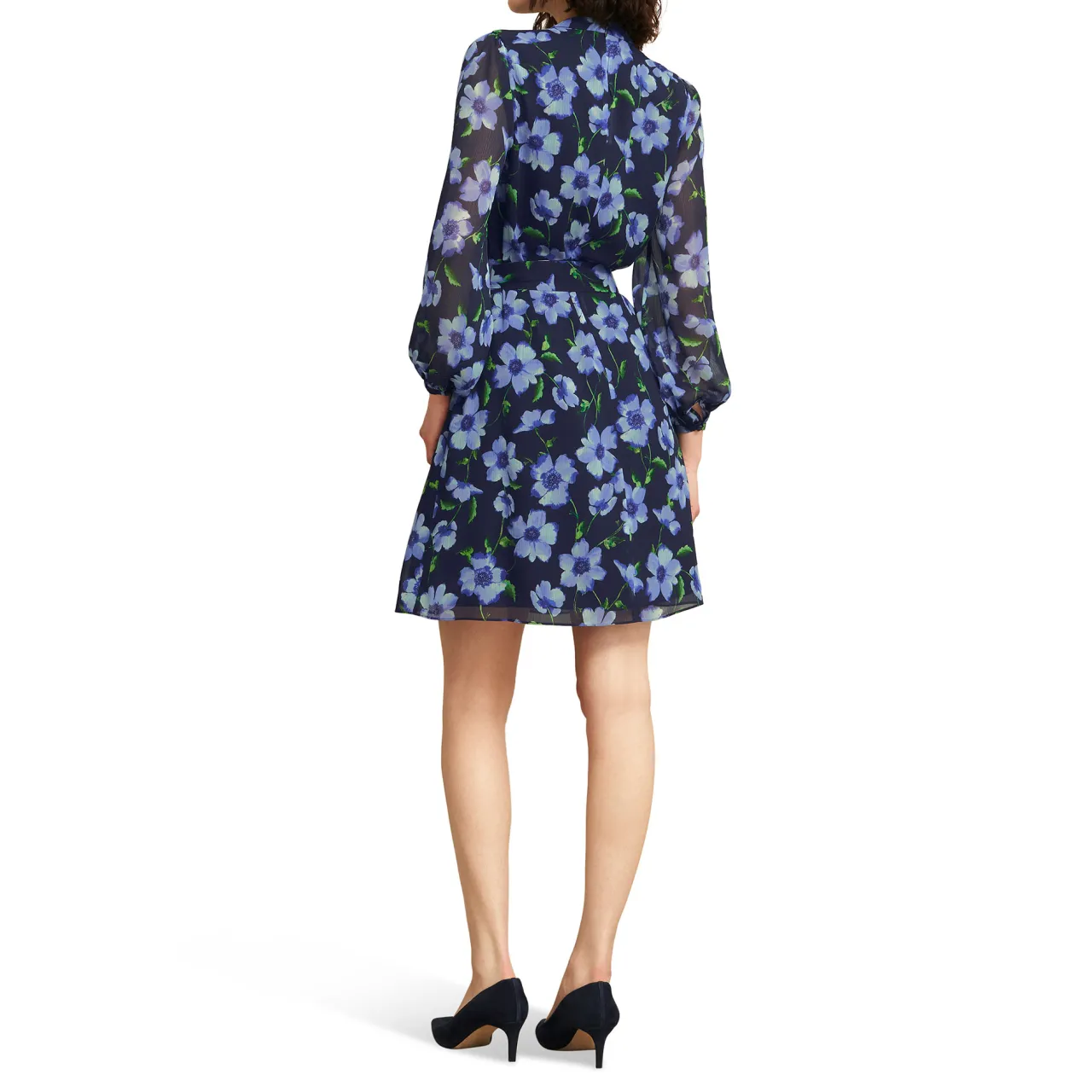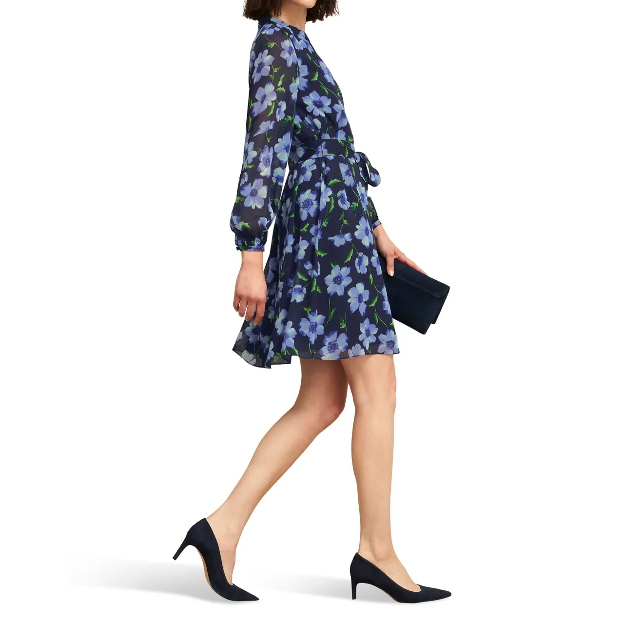 - Lightweight crinkle fabric, lined through bodice and skirt, detachable tie waist, long blouson sleeves, buttoned cuffs, mini length, mandarin collar, floral print, zip and hook fastening, woven