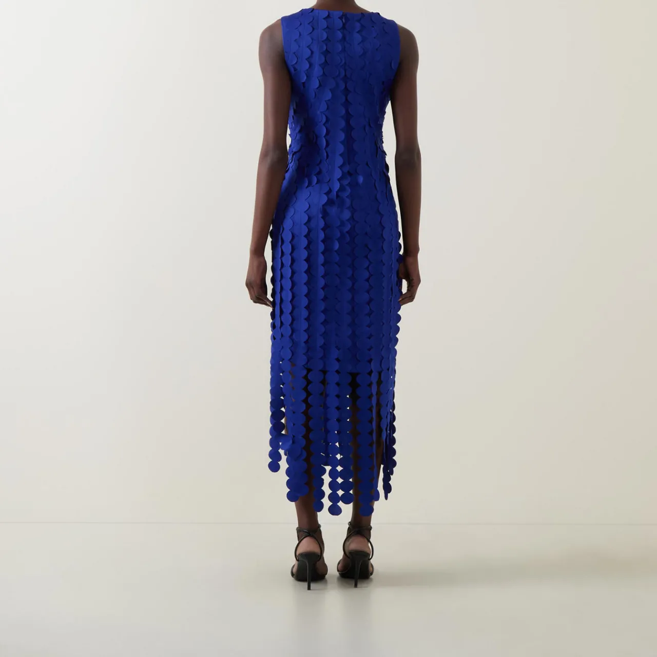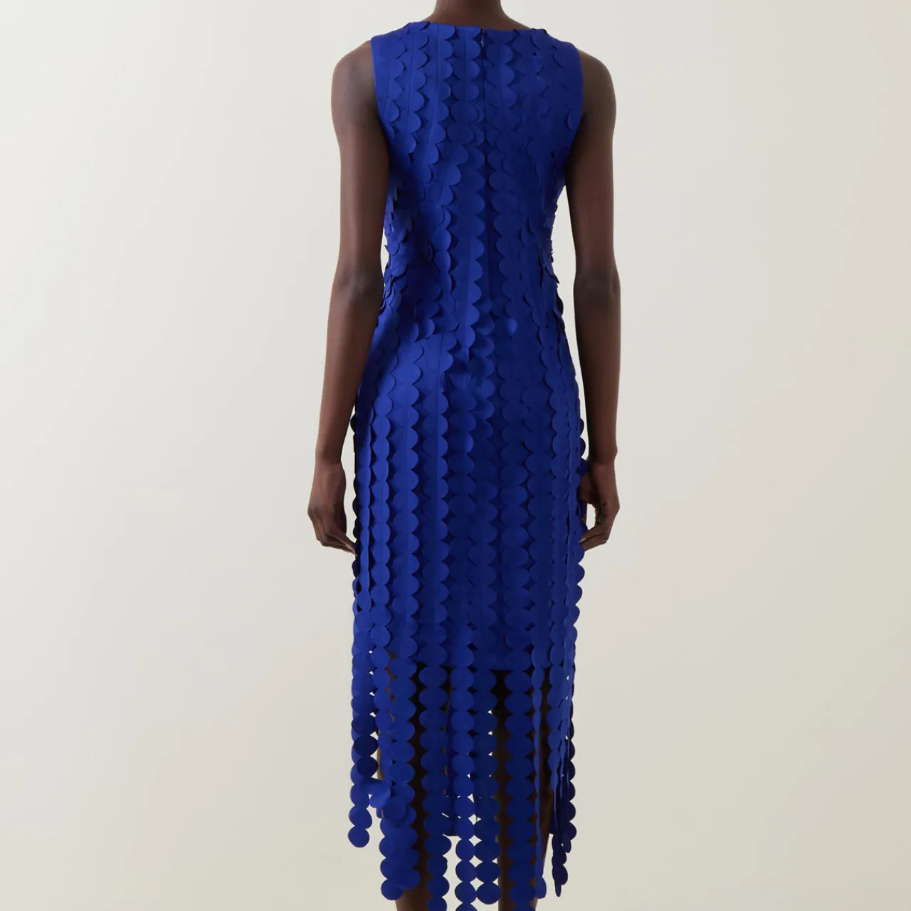 - Boat neckline, sleeveless design, concealed rear zip fastening, sheath silhouette, laser-cut circle fringe detailing, midi length
