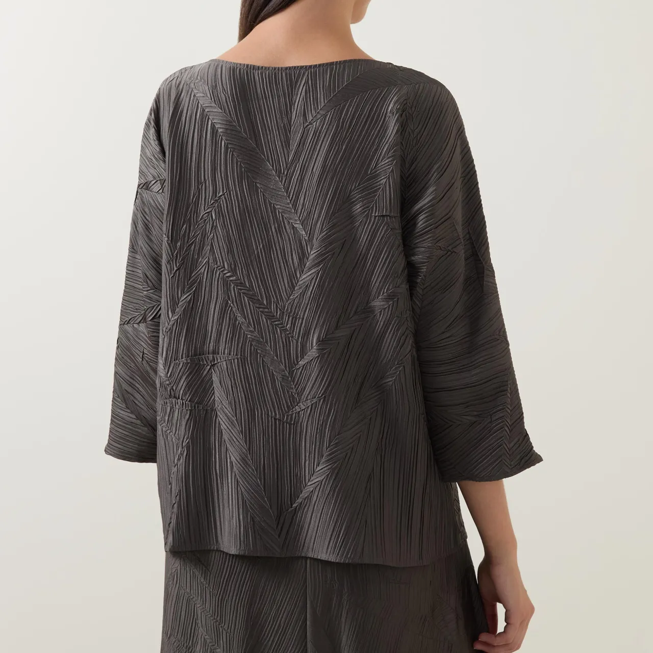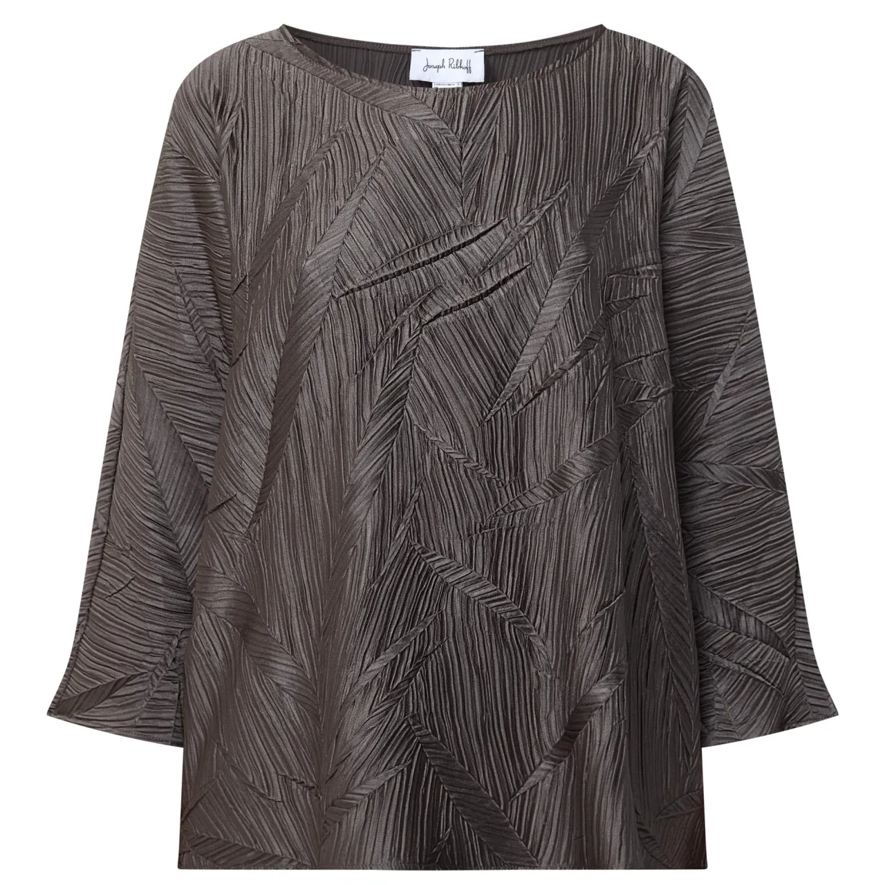 - Wide round neckline, three-quarter length sleeves, flared hem, textured pattern