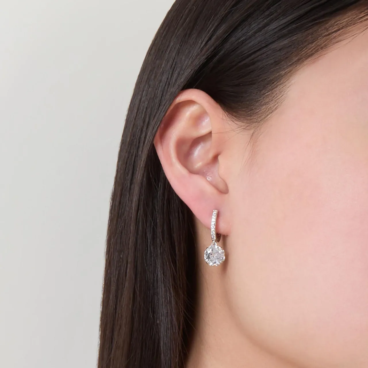 - Huggie-style, drop pendant, hinge fastening, cubic zirconia stone detailing, handcrafted, silver-tone finish