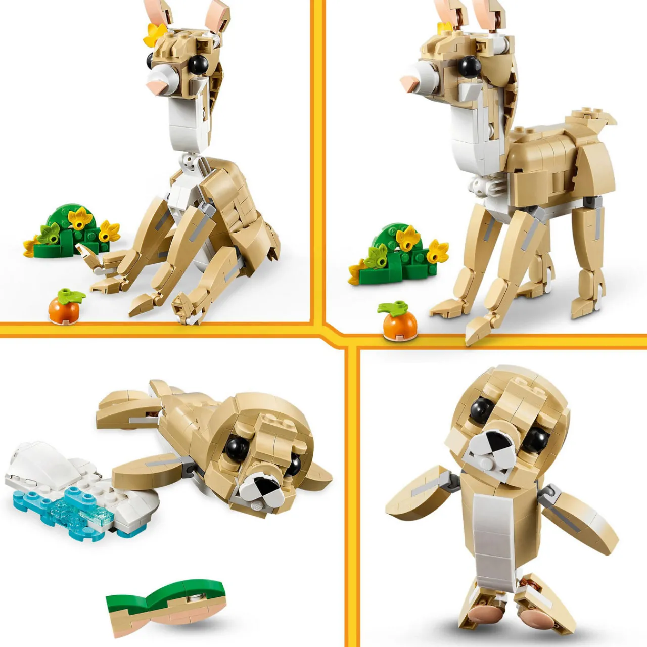 - 326 pieces, builds three posable animal figures, bunny can move its head, ears, forelegs and hind legs; the llama toy can move its ears, head, tail and feet; and the seal toy can move its head, neck and flippers