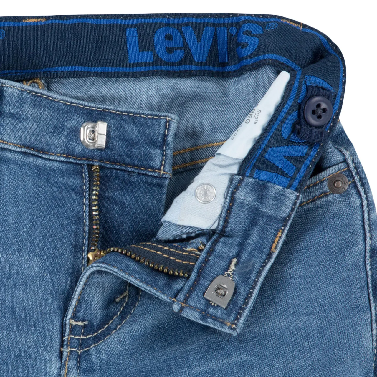 - Tapered silhouette, performance denim to wick away sweat, helps regulate body temperature, five-pocket design, adjustable waistband, belt loops, brand logo patch, whiskering, fly and button fastening, mid wash