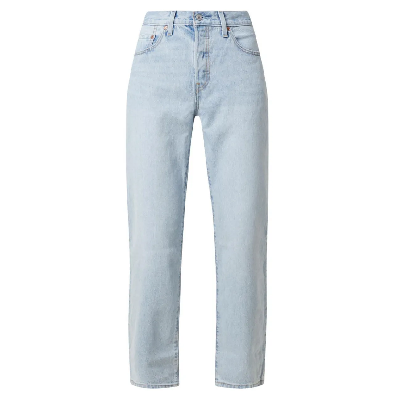 - High rise, straight leg, five-pocket design, branded patch.