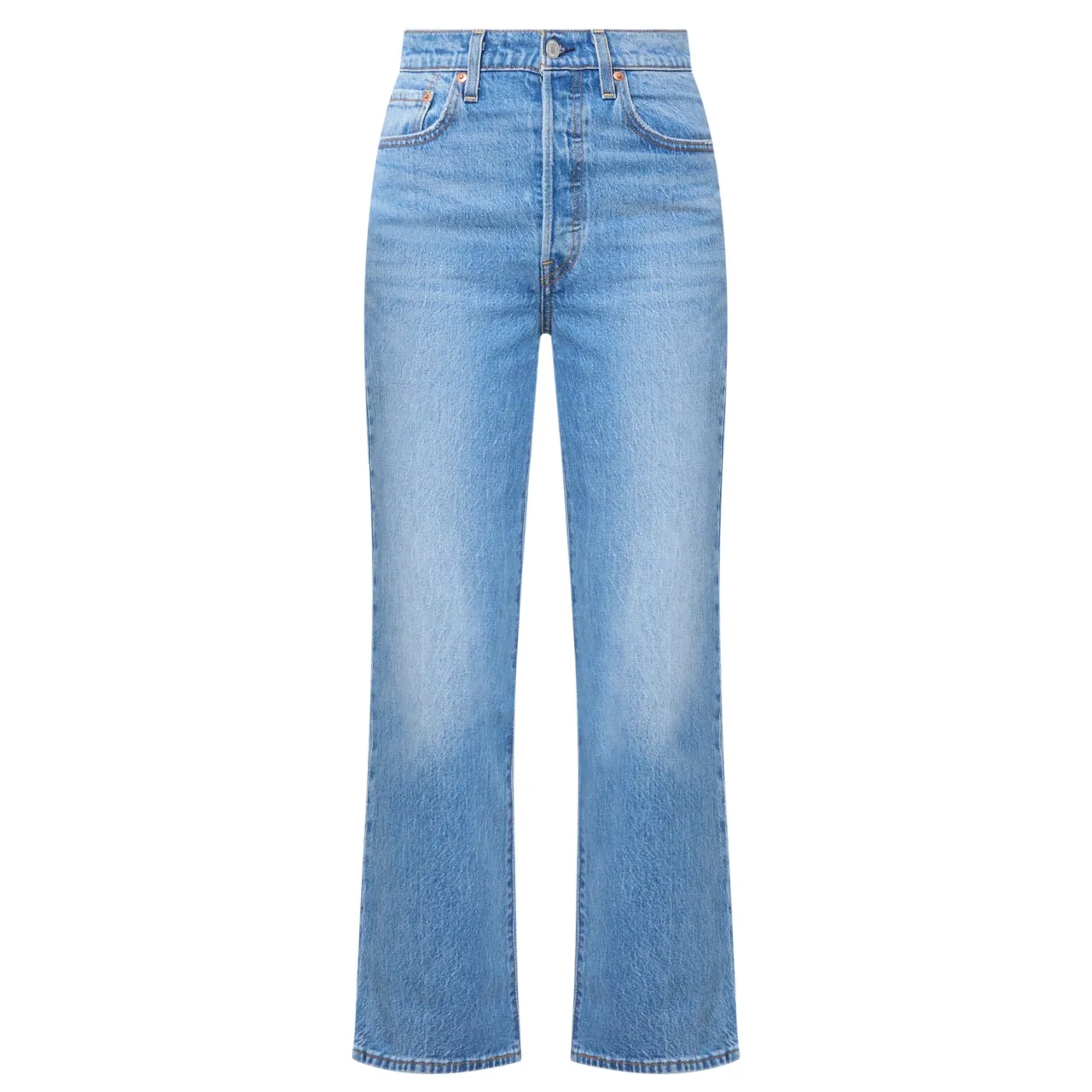 - High-rise, straight leg, ankle length, hip slimming and waist defining, belt loops, button fly, five-pocket styling, clean hems, rear logo patch, tobacco stitching, light wash finish