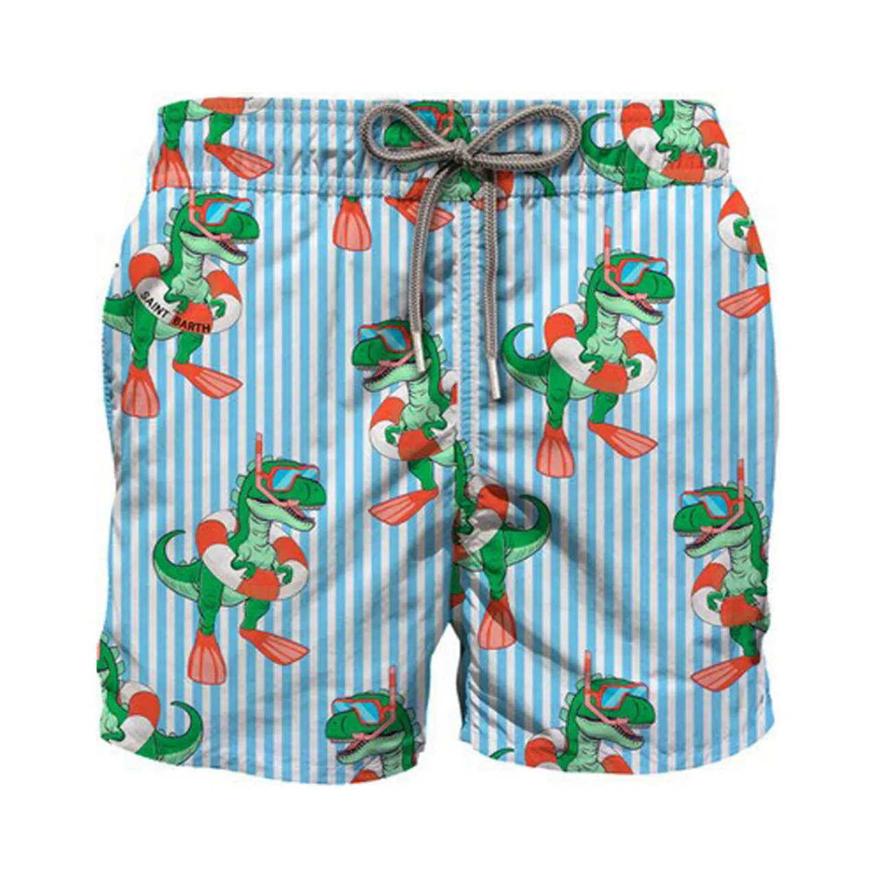 - Elasticated waistband, adjustable drawstring, side pockets, internal mesh, all-over dinosaur print, striped design