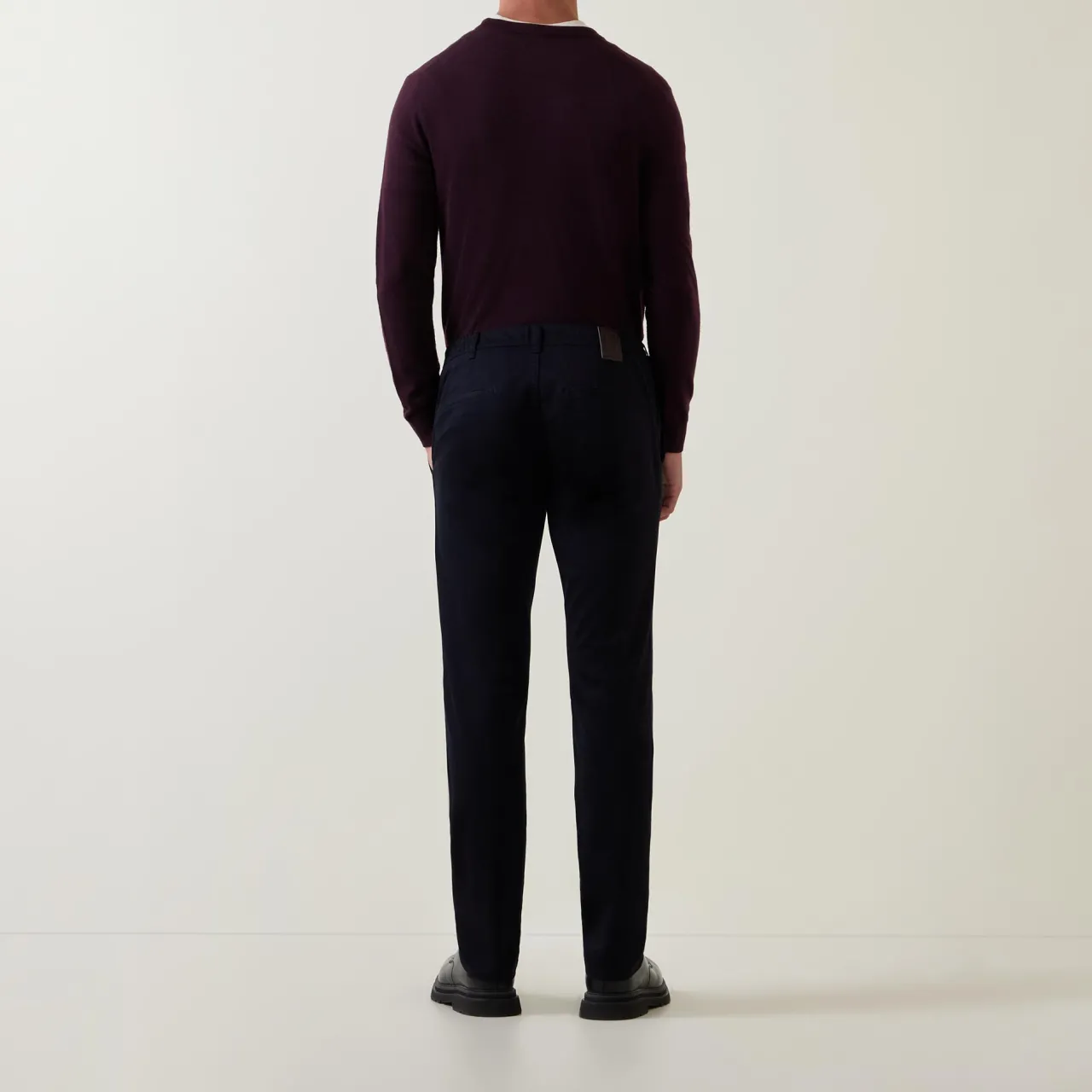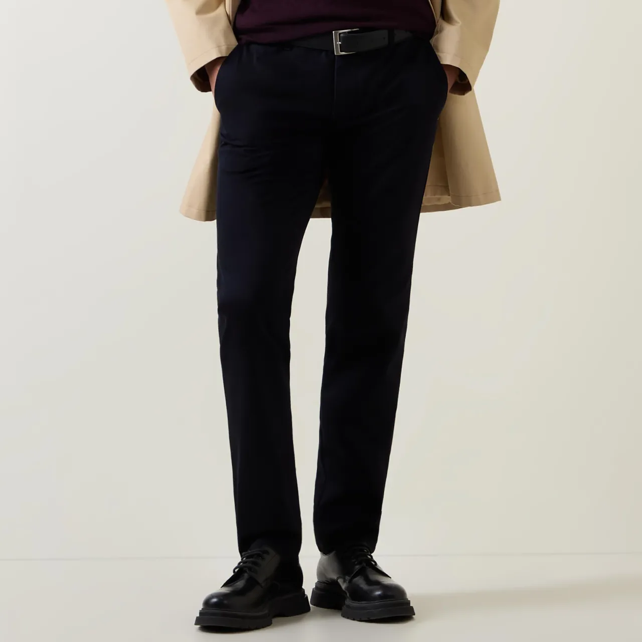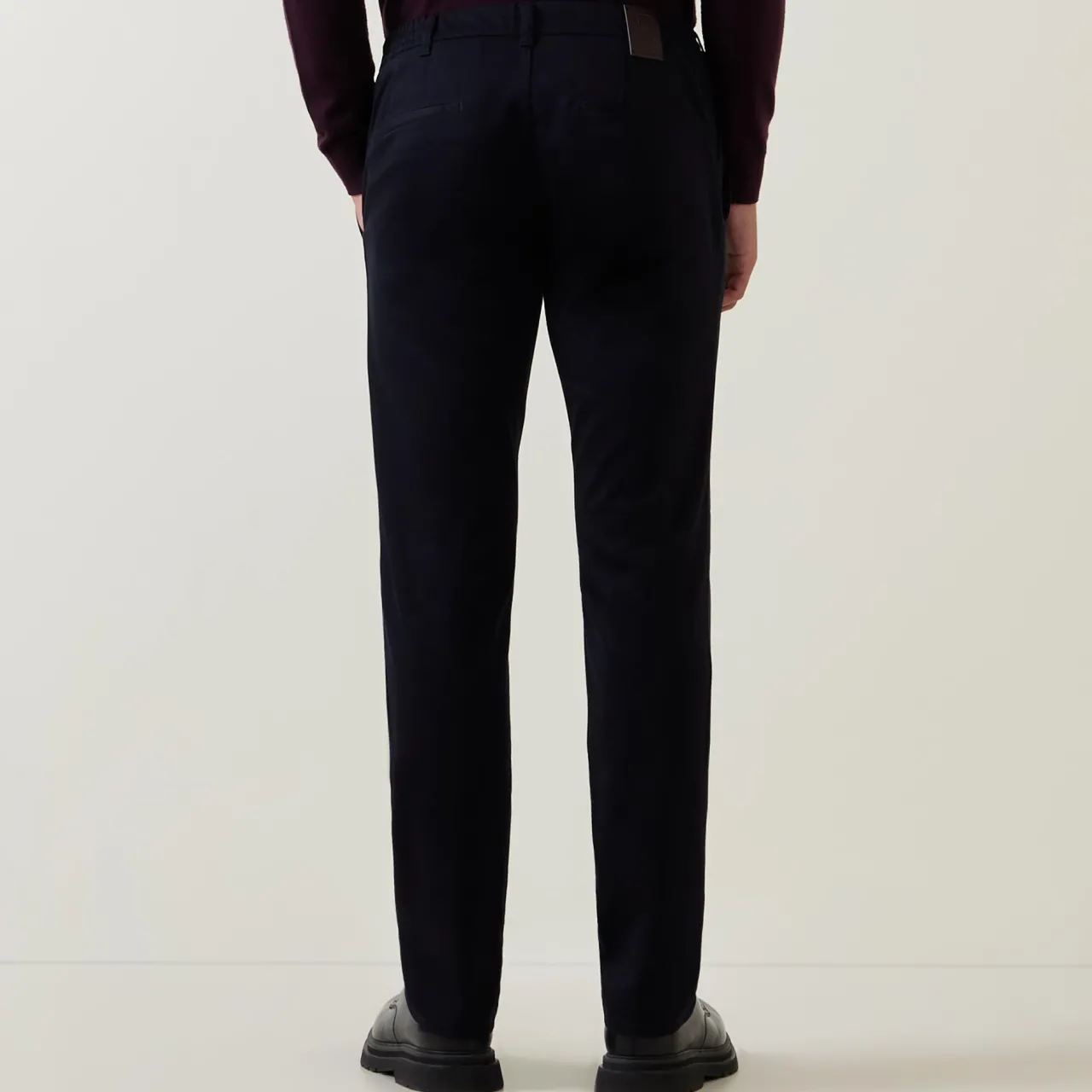 - Mid-rise, slim leg, belt loops, concealed fly and button fastening, two side entry pockets, two rear patch pockets, clean hems, rear logo branding, tonal stitching