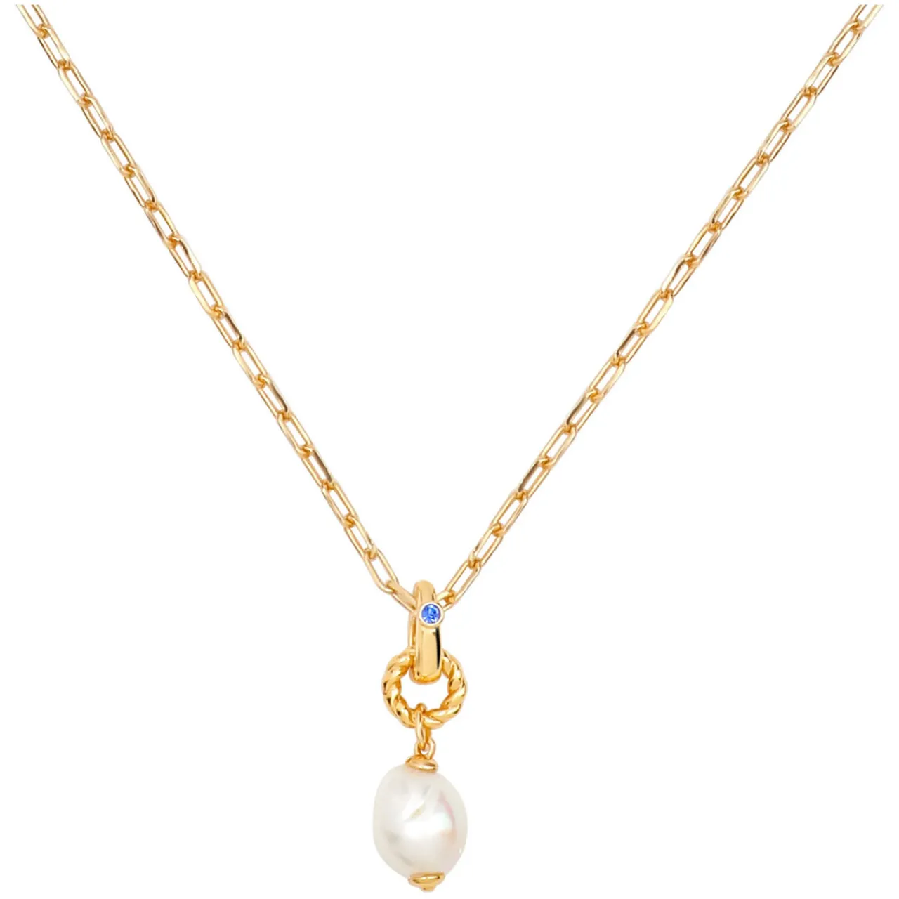 - 14k Gold Plated Pendant, with a protective anti-tarnish layer, baroque pearl and sapphire blue crystal stone settings, drop pendant design