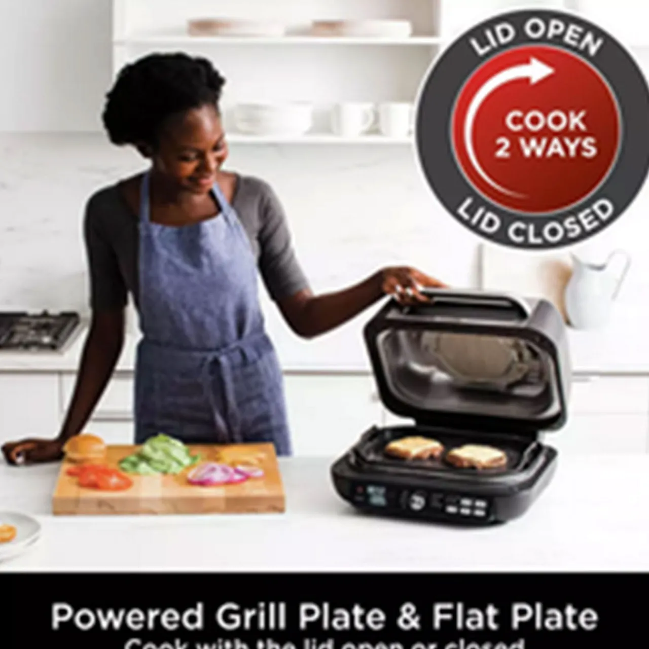 The large capacity grill and flat plate that precisely cooks with perfect results. Take everyday cooking to the next level with 2 interchangeable grill plates : The Powered Grill Plate delivers high heat searing to lock in juices and create intense chargrilled results, perfect for sizzling steaks, pork chops, halloumi skewers, marinated chicken breasts, tuna steaks and more. Switch to the Flat Plate to sear and saute delicate ingredients such as prawns and scallops, fajitas, pancakes, eggs and more. Cook with the lid open or closed.