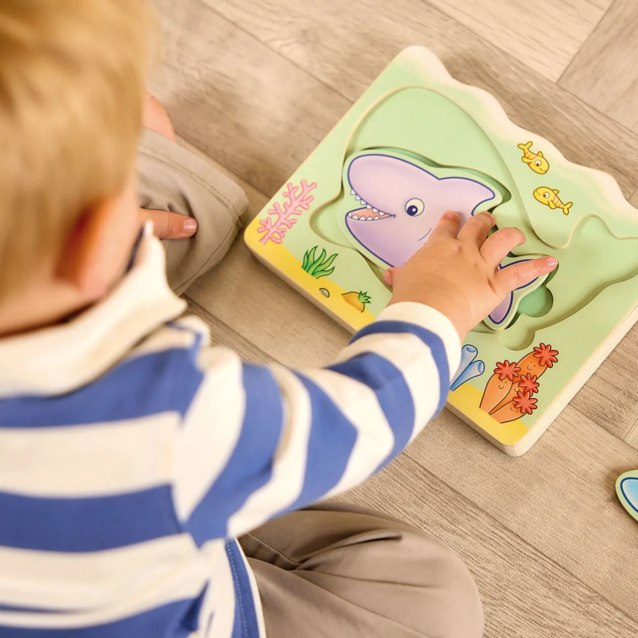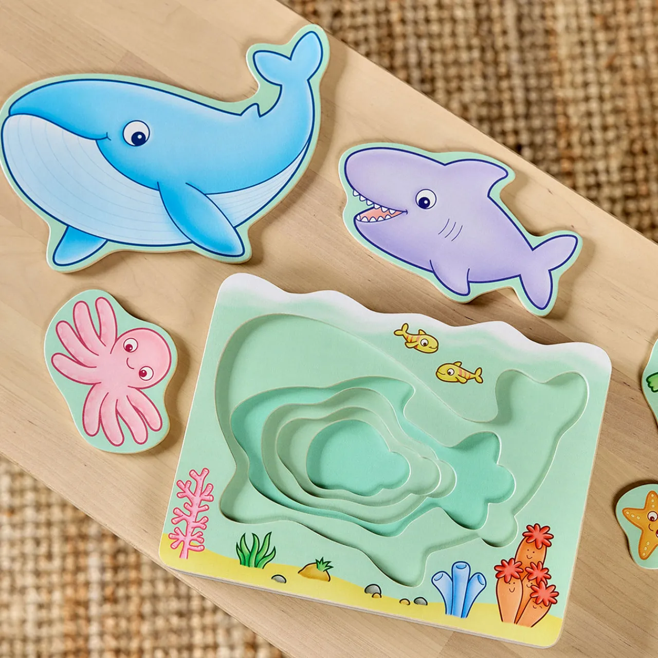 - Under the sea theme, illustrated sea creatures, wooden nesting puzzle, five durable pieces, chunky board, encourages early developmental skills