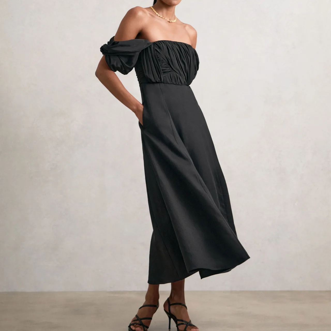 - Bardot neckline, gathered bodice, twisted off-the-shoulder sleeves, flared midi skirt, concealed zip fastening to reverse