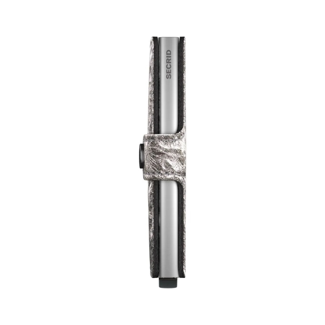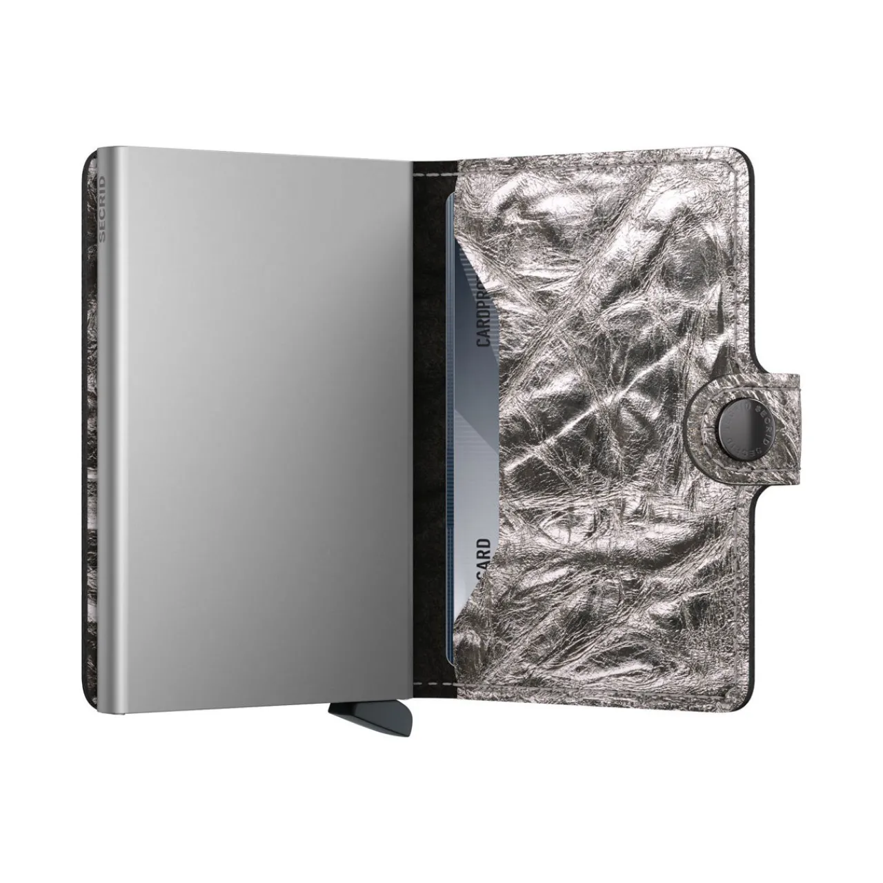 - Crunch metallic leather finish, gold-tone hardware, brand logo detail, fold-over button closure, aluminium Cardprotector case, slide mechanism