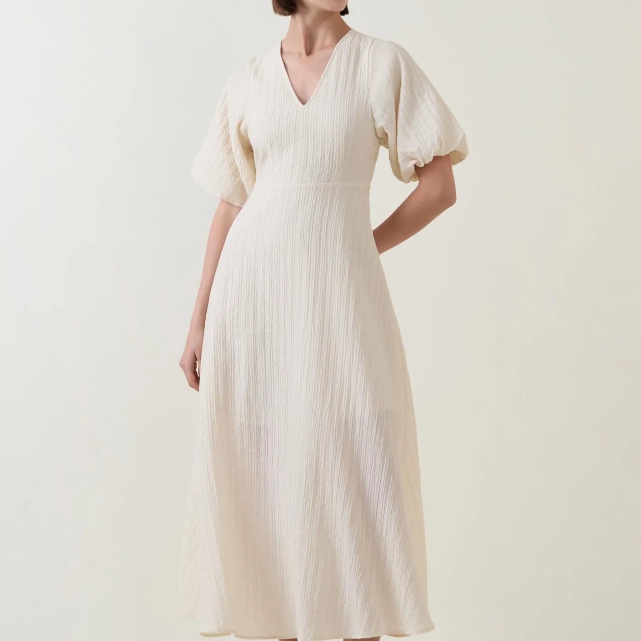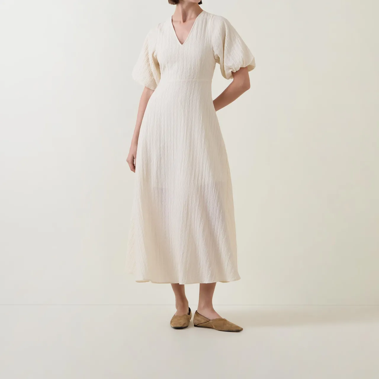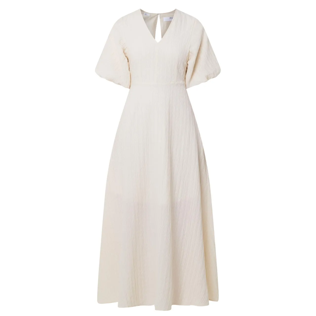 - Short puff sleeves, V-neckline, back keyhole and button fastening, back tie-fastening closure, flared silhouette, midi length