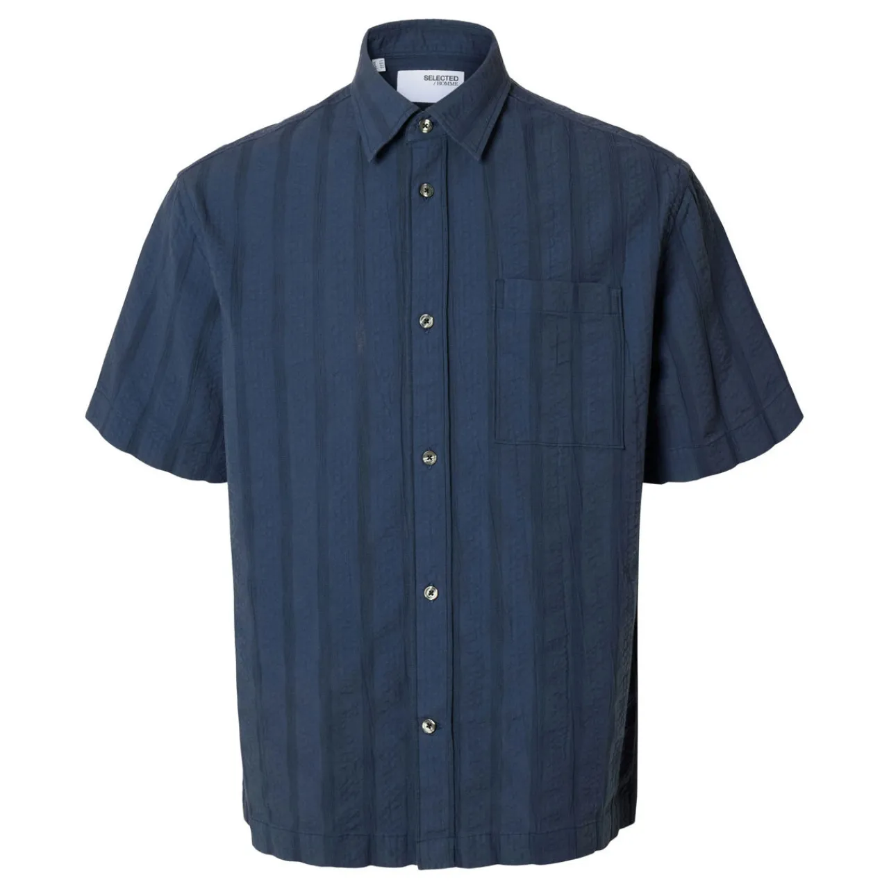 - Shirt collar, short sleeves, button fastening, straight hem, tonal striped design