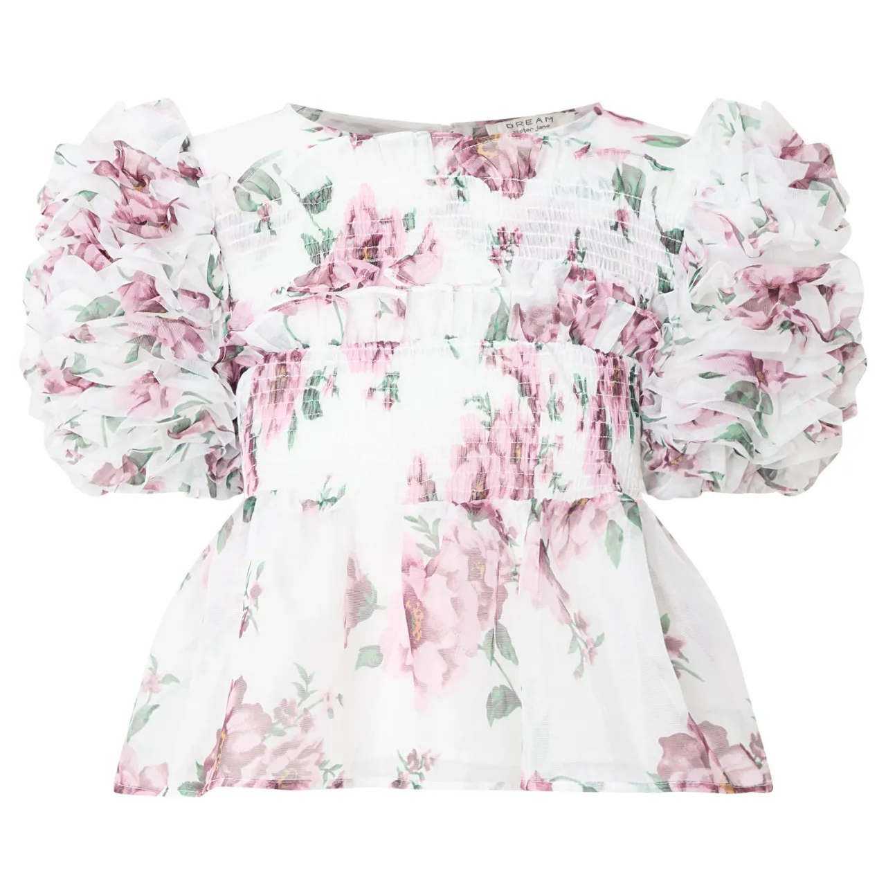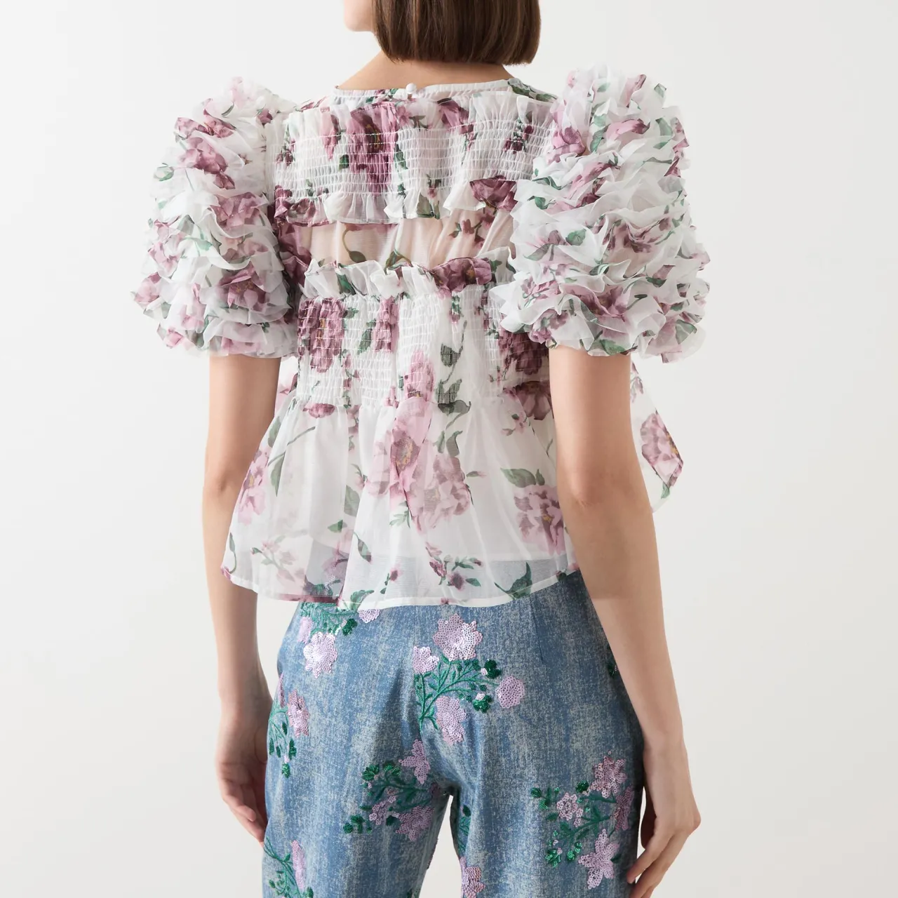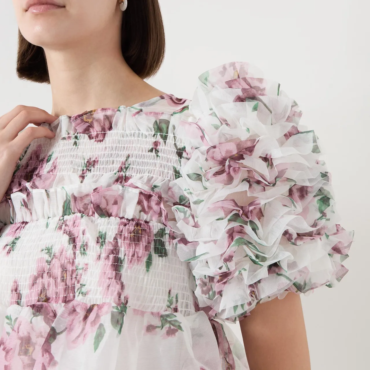 - Ruffle detailing, cropped length, floral print, lined, shirred bodice, button fastening