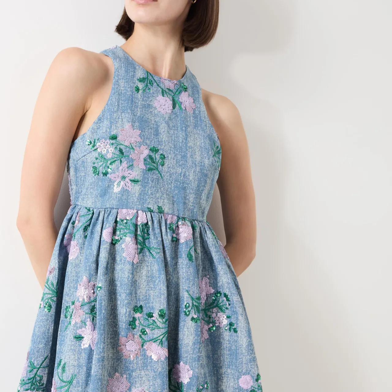 - Round neckline, embellished detailing, mini length, sleeveless, babydoll style