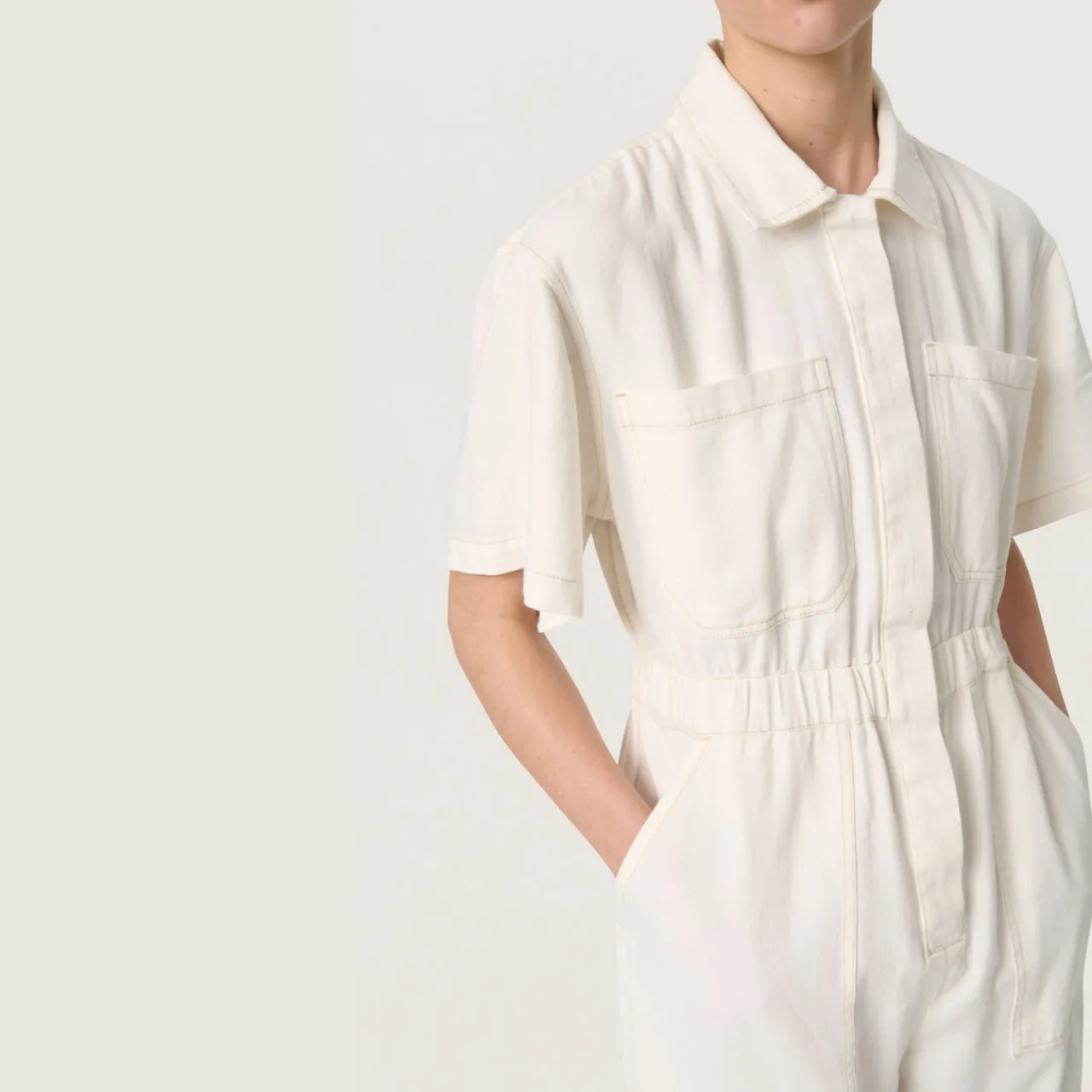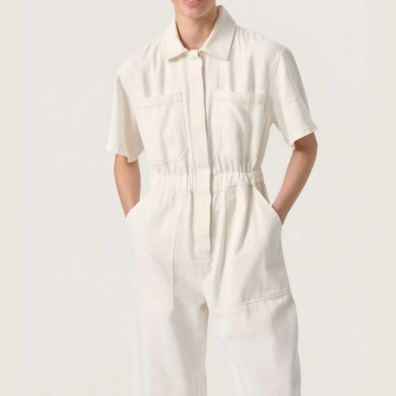 - Flat collar, concealed fastening, patch pockets, side entry pockets, short sleeves, elasticated waistband, wide-cut legs