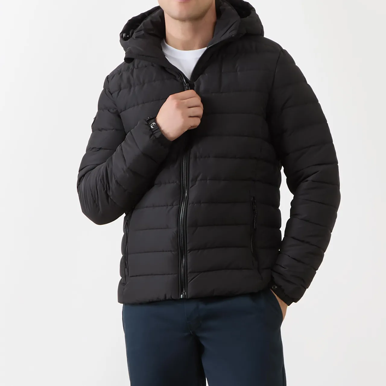 - Funnel neckline, hood with toggle adjustable fit, zip fastening, padded, long sleeves, elasticated cuffs with snap button adjustable fit, zipped side entry pockets, logo badge at sleeve