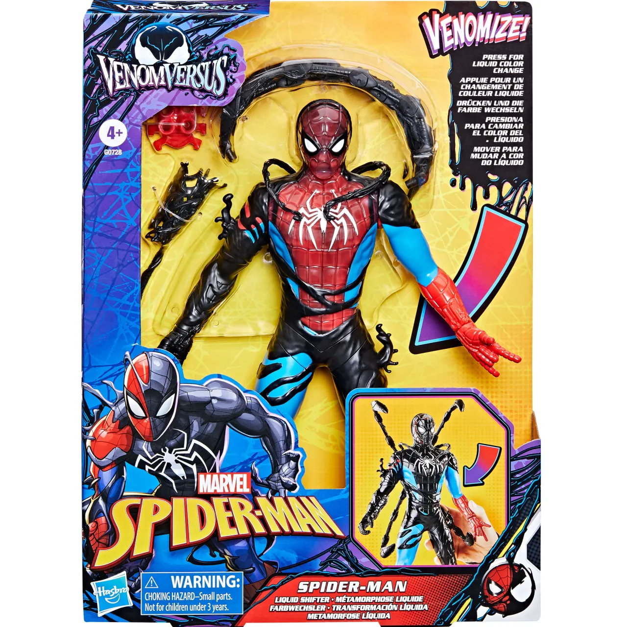 - Spider-Man Liquid Shifter action figure, features Venomized Spider-Man suit design and deco, 6 accessories, press figure’s arm to activate the liquid-shift feature and watch as black liquid Venomises Spider-Man, once released the black liquid will recede