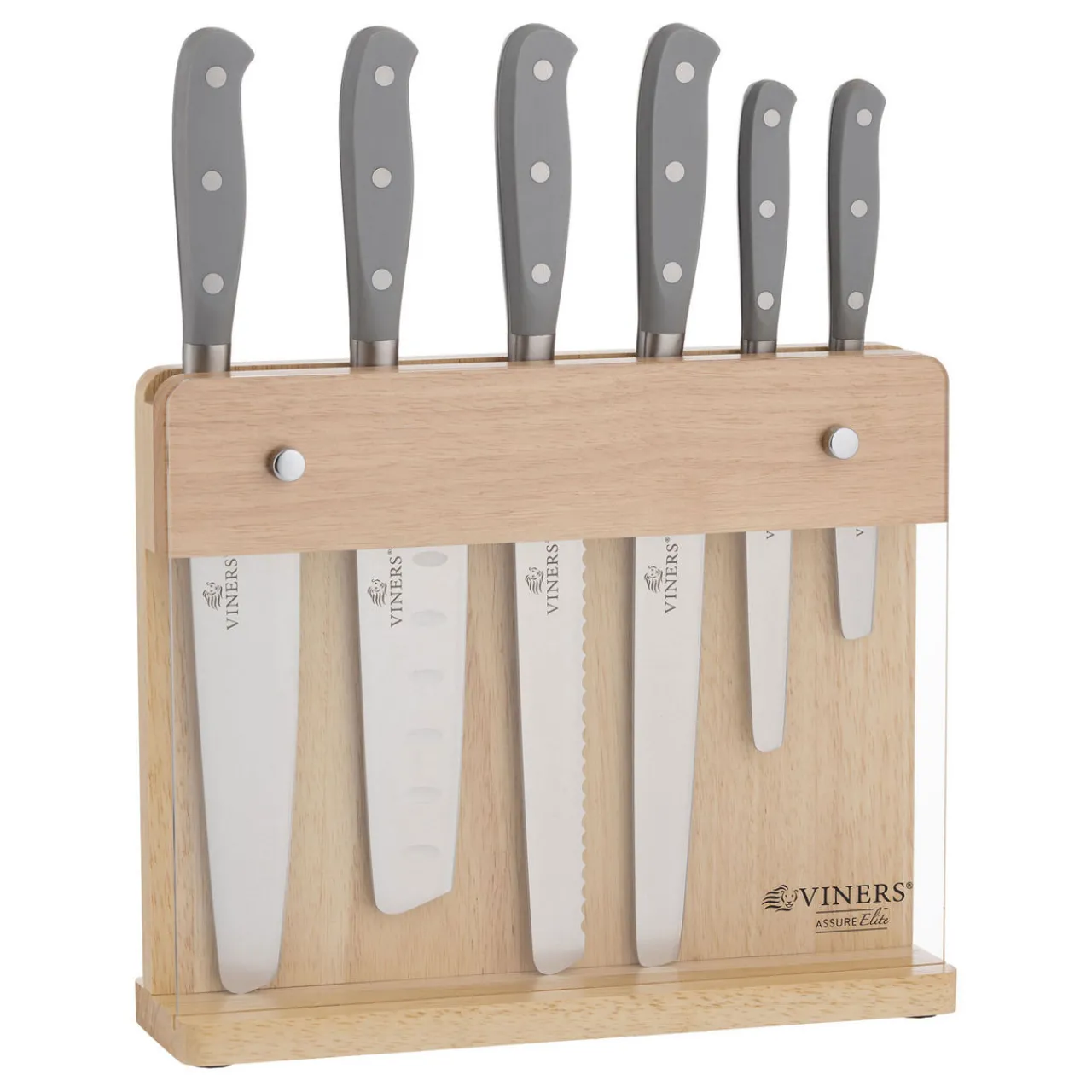 - Contemporary rubber wood block with a clear acrylic front, distinctive square tipped blades, 3 point rivets provide a secure connection from the blade to the handle, the handle material provides optimum comfort and grip with a bolster located at the front, adding equal weight throughout the whole piece