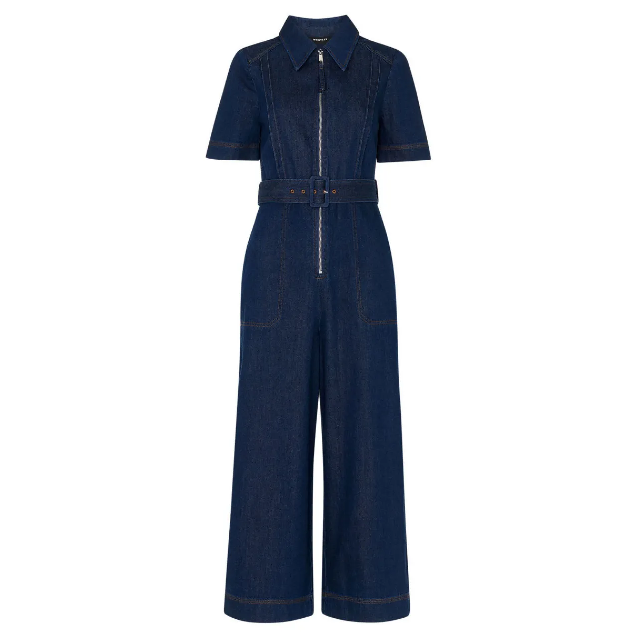 - Point collar, exposed zip fastening, pintuck detailing, two front pockets, two back pockets, matching belt, wide leg
