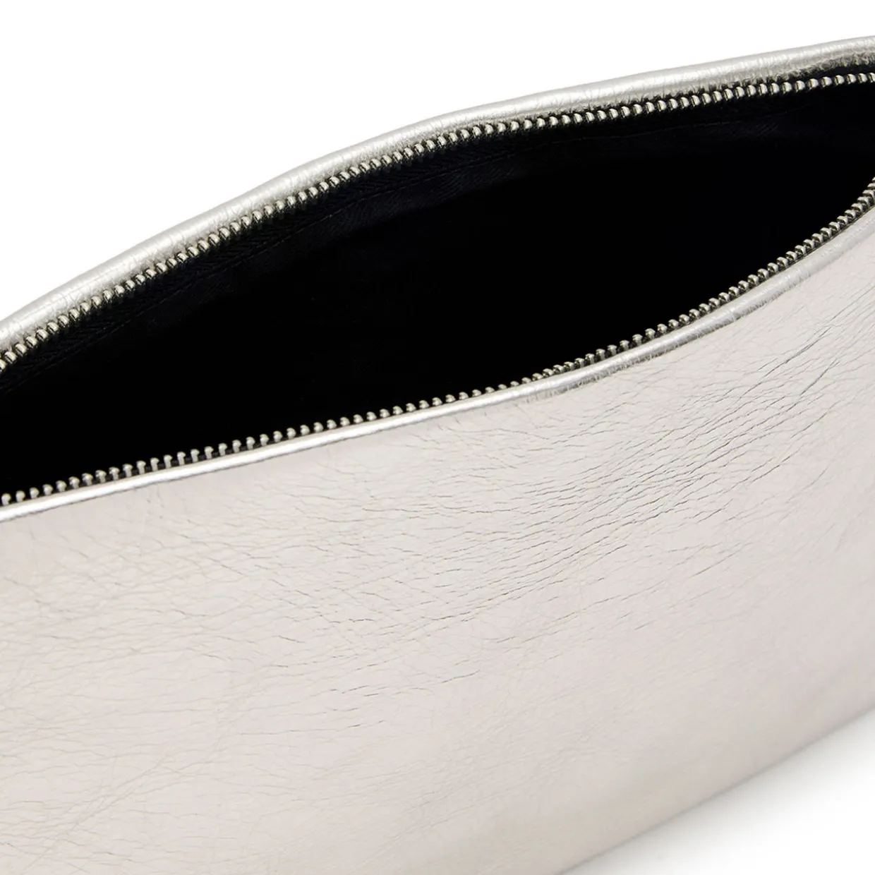 - Top zip fastening, silver-tone hardware, textured metallic finish, logo detail