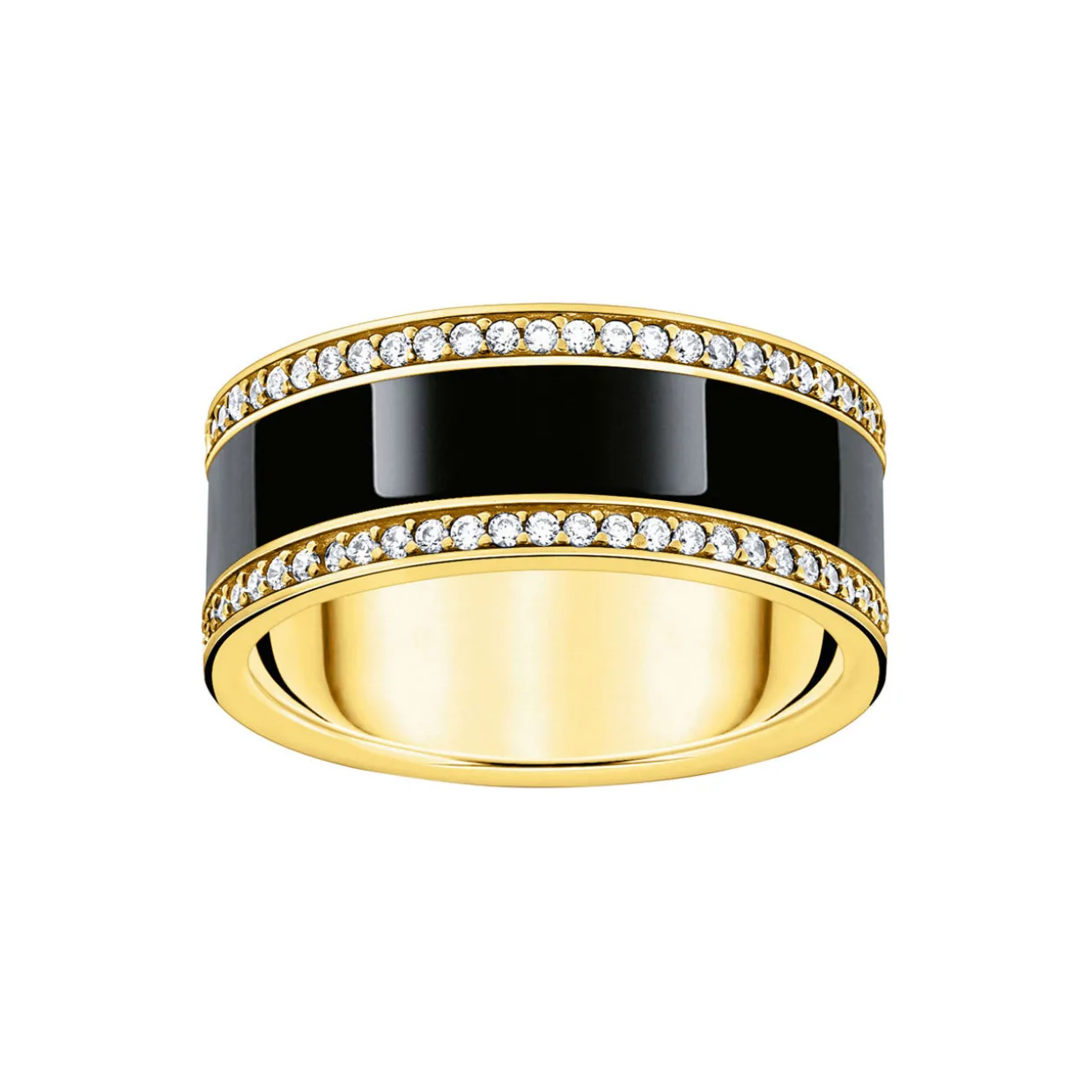 - Band ring, wide style, gentle rounded, cold enamel details, 750 yellow gold-plating, white stone embellishment in a pavé setting