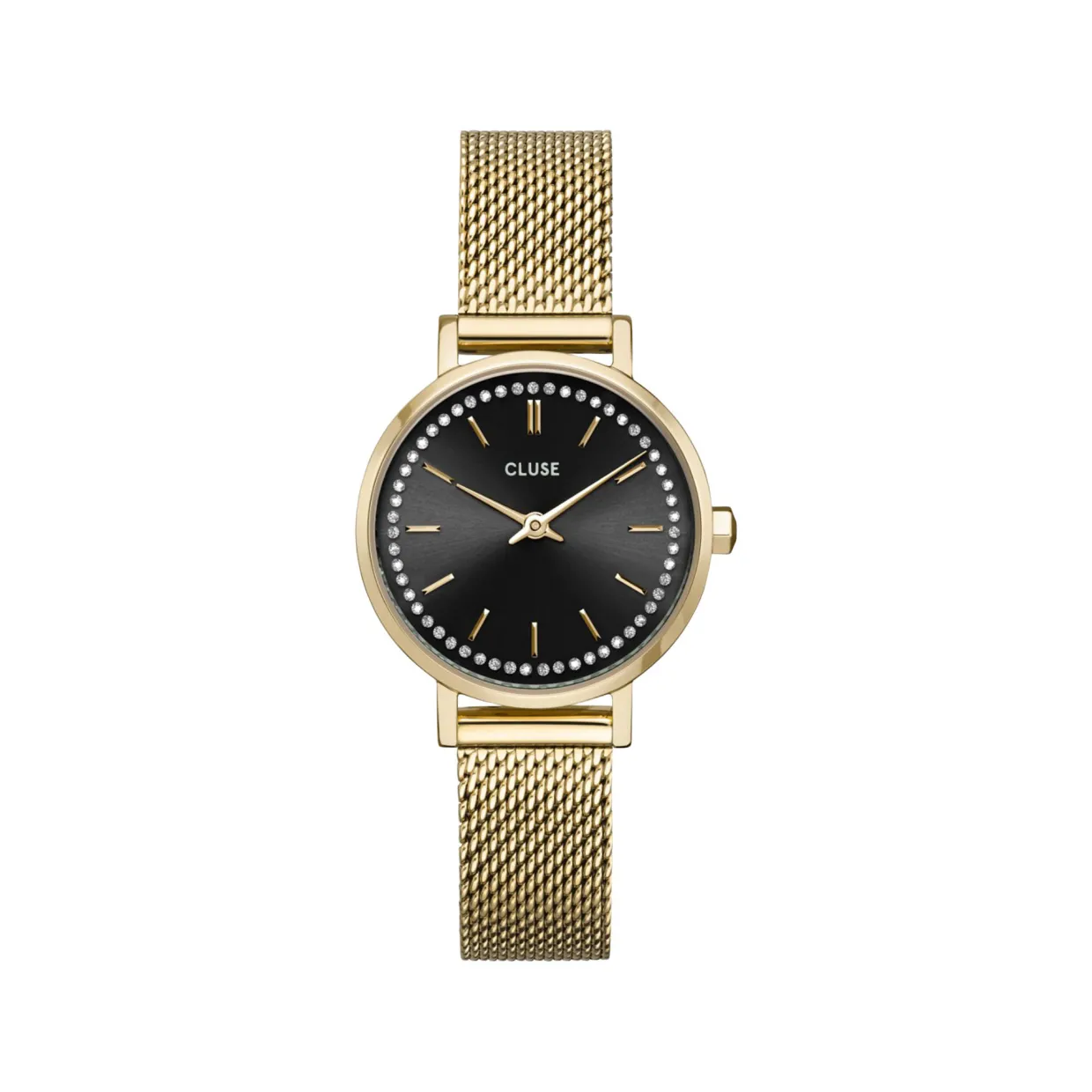 - Crystal-embellishment, gold-tone round case, mesh strap, interchangeable strap, water resistance 5 ATM