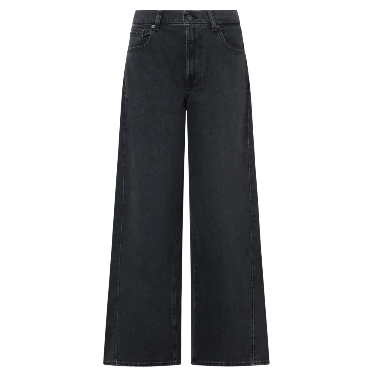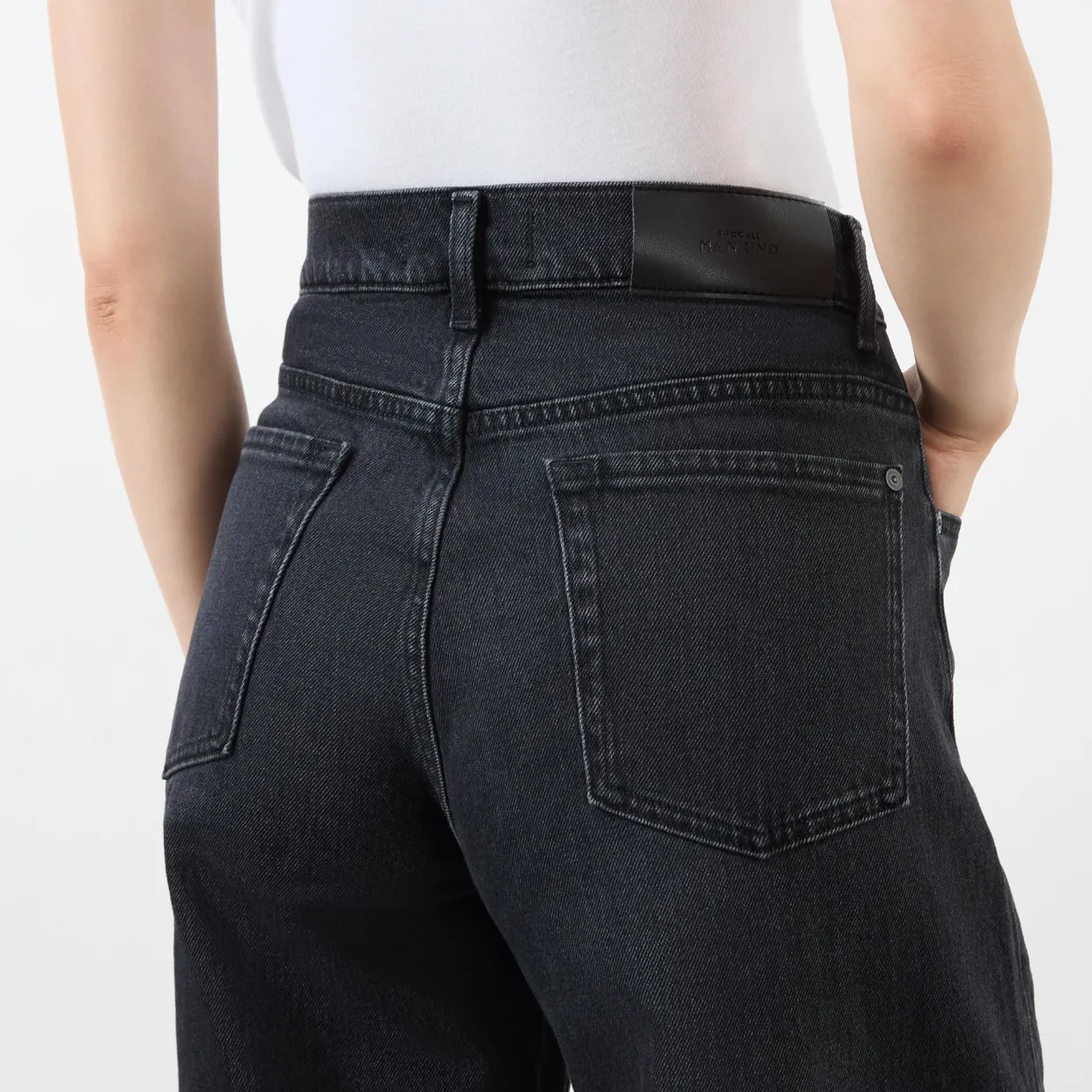 - Zip-fly and button fastening, belt loops, five-pocket design, tonal stitching, rear logo patch, high-rise, tapered wide-cut leg, smooth denim finish