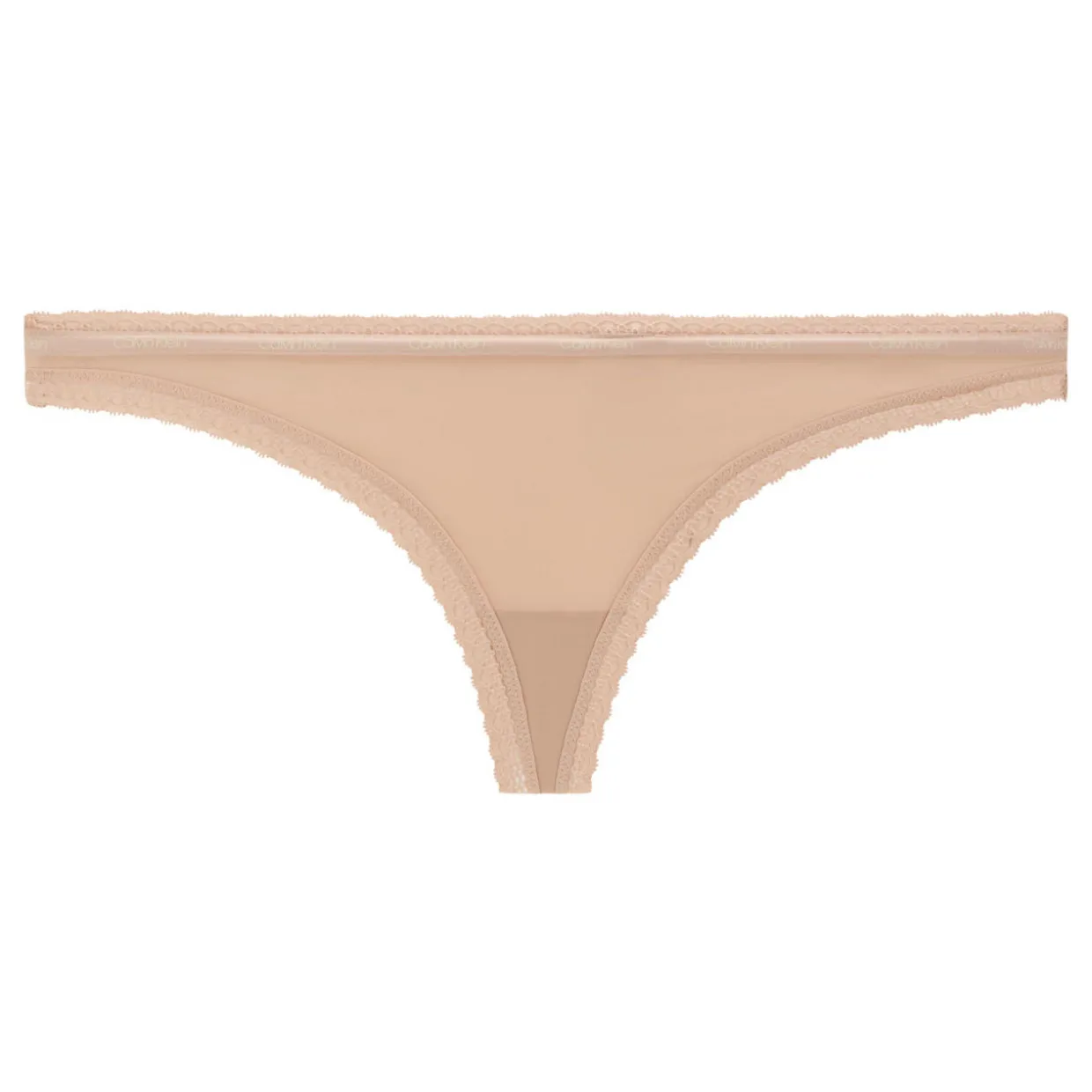 - Mid-rise, thong-style design, repeat logo detailing, lace scallop-trim edging, smooth finish