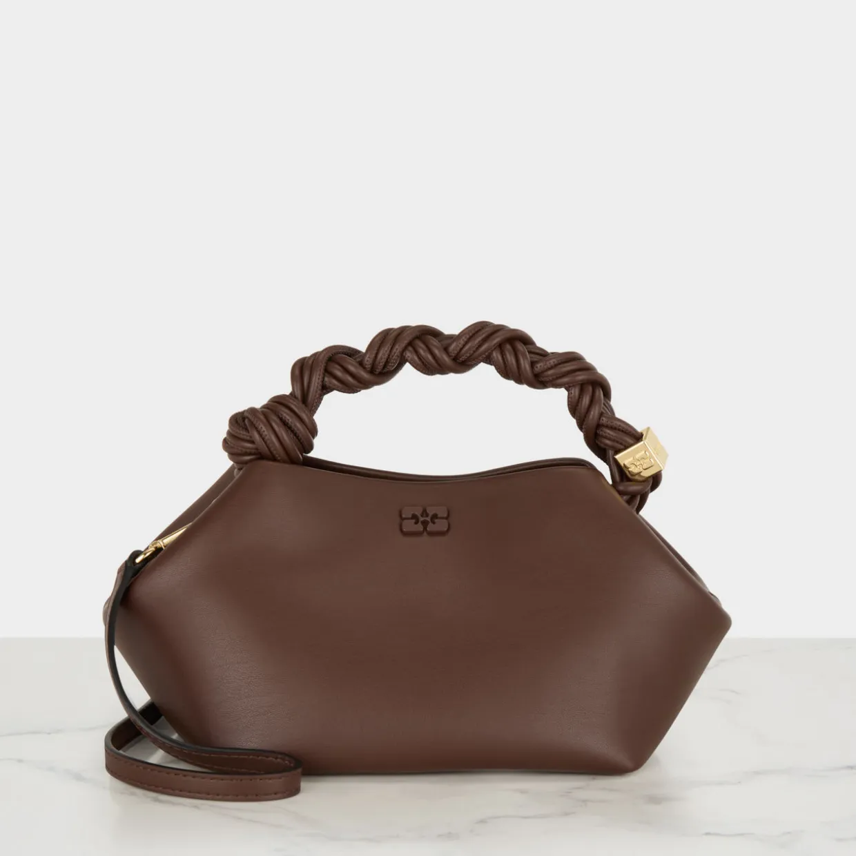 - Braided top handle, adjustable and removable shoulder strap, branded dice charm, gold-tone hardware, magnetic closure, butterfly logo, smooth finish